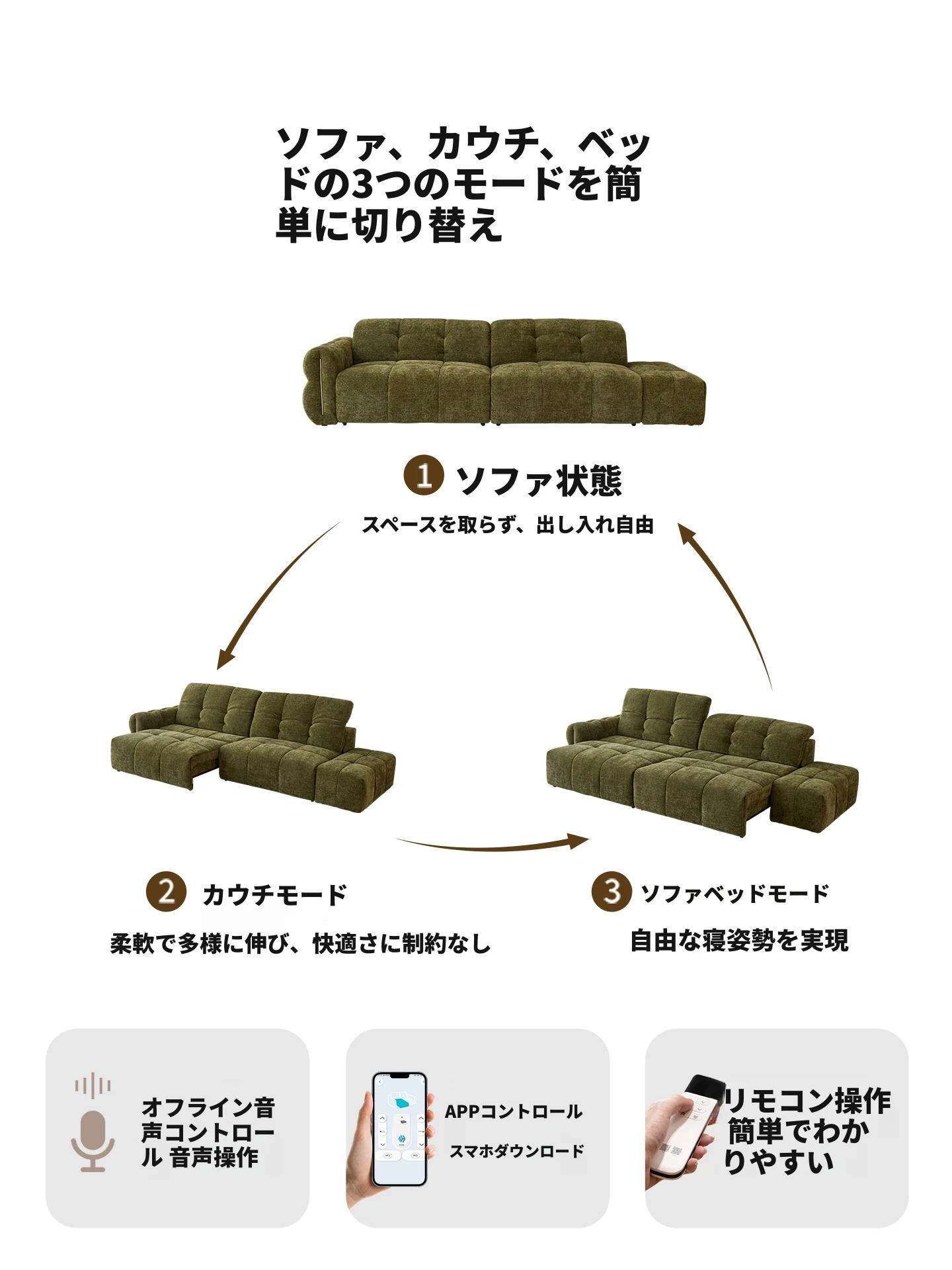 カサチ電動伸縮ソファ 2025年新作 フレンチアンティークスタイル ピクセルグリーン シェニールファブリックソファ リビングに最適な優雅なデザインで、心地よいくつろぎを提供します。