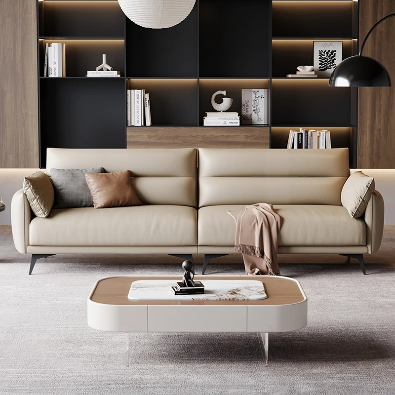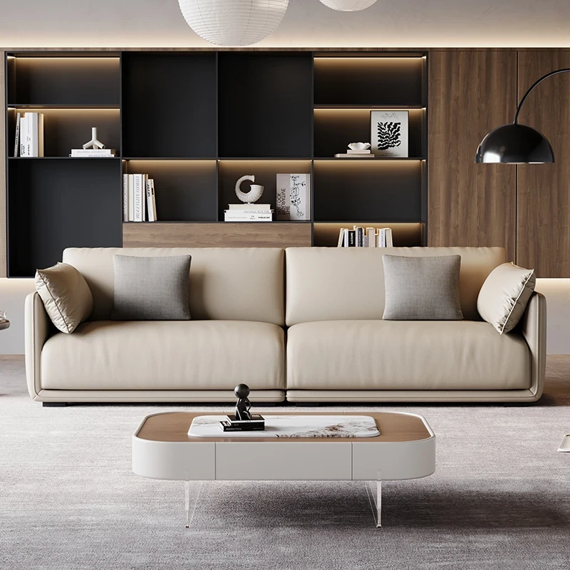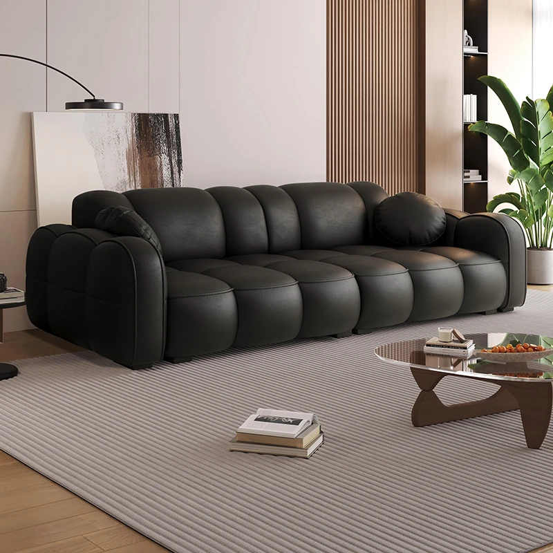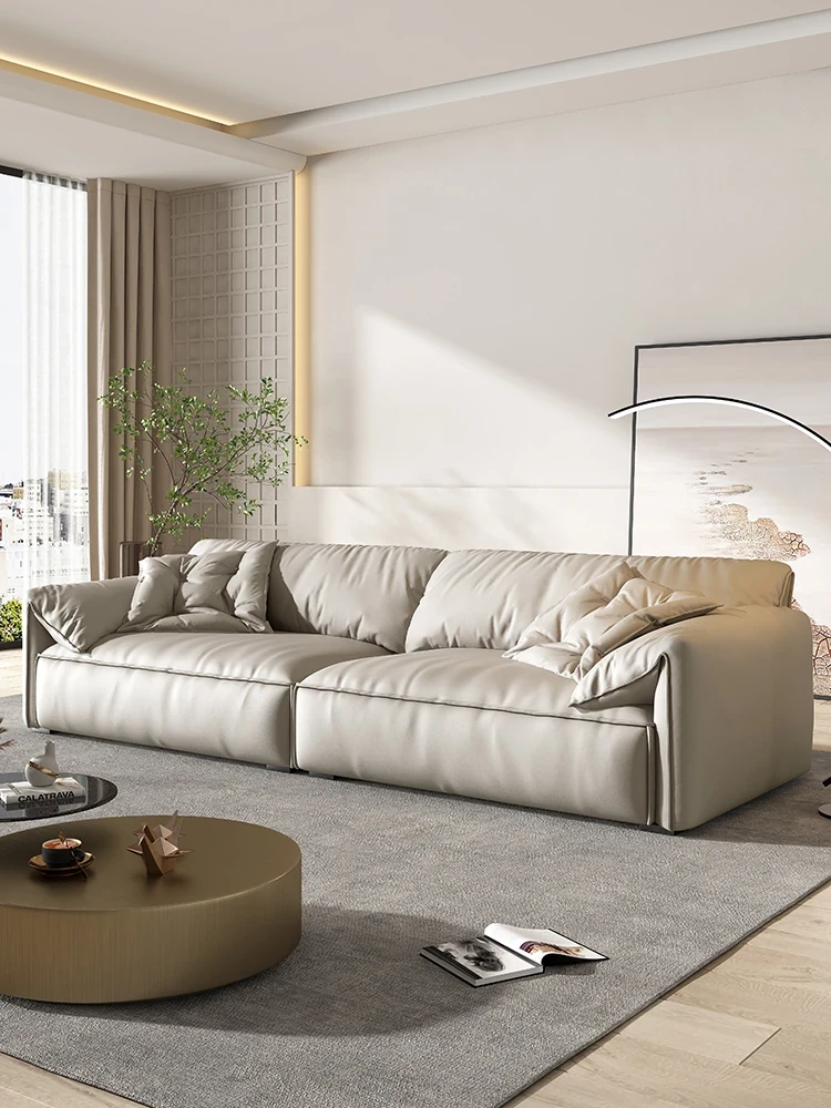 2025年新作 フレンチクリーム風 モダンビスケットキャットグラブレザー シンプルストレートソファ リビング用 プフソファで、スタイリッシュな空間を演出!