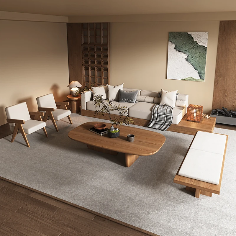 侘寂スタイルの無垢材&ファブリック直線ソファ - モダンでシンプルなホテルのモデルルームやヴィラに最適な接客用ソファチェア!心地よい空間を演出し、訪れる人々に安らぎを提供します。