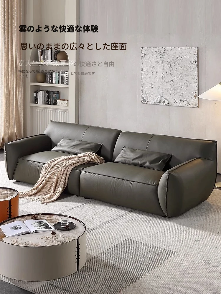 大きなサイズの本革イタリアンミニマリストデザインソファ - 上質なトップグレイン牛革使用、広々としたリビングルームや小型住宅にもぴったりの侘寂スタイル!快適さとスタイルを両立させた理想のソファ。