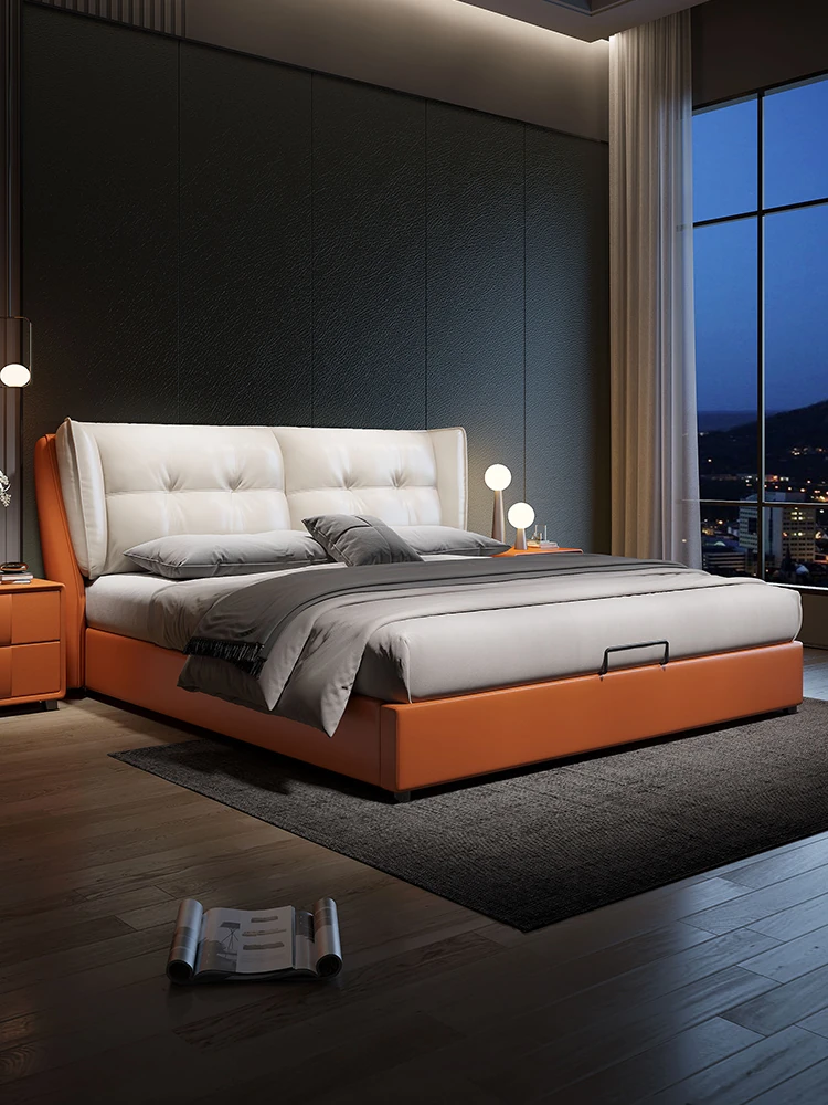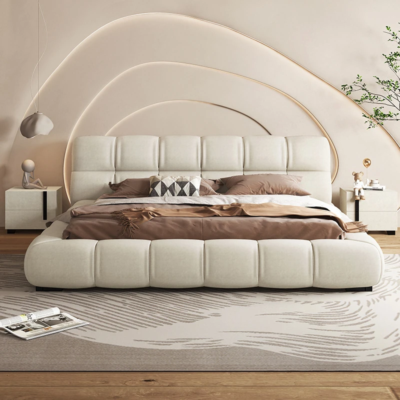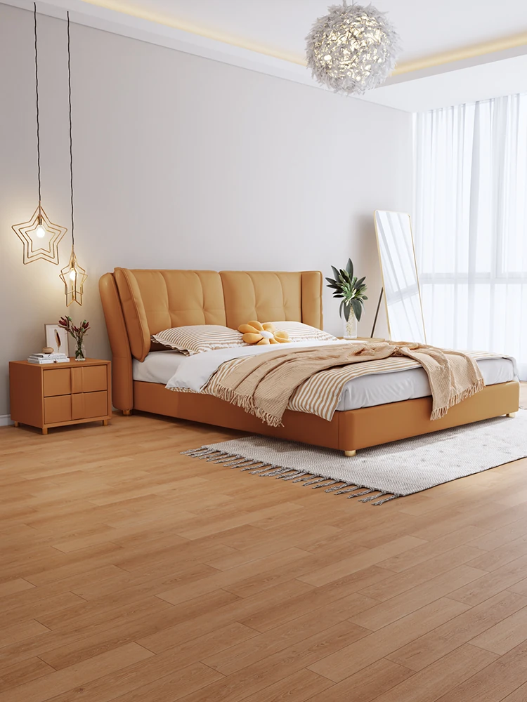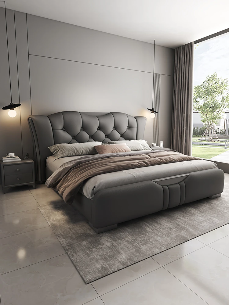 ダブルイタリアンミニマリズムエレファントイヤー高級ダウン軽奢主寝室用レザーベッド・トレンドのソフトパッケージ婚礼ベッド、新作登場!快適さと洗練されたデザインで、あなたの寝室を贅沢に演出します。