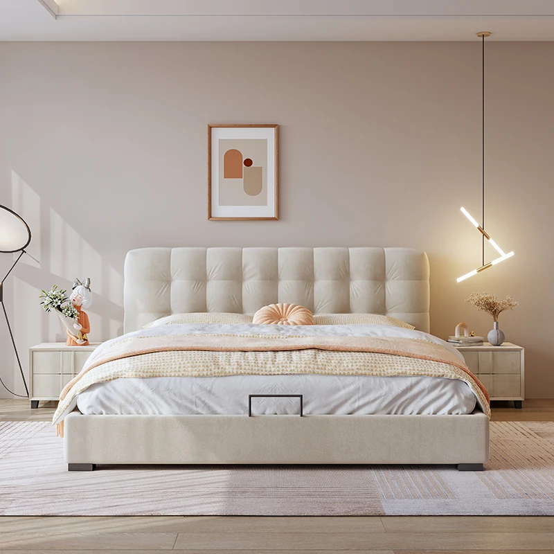 軽奢スタイルの人気インフルエンサーおすすめ!クリーム風デザインの主寝室用ダブルベッド。テクノロジー起毛ファブリック使用、全てが無垢材で作られたガス圧収納付き。理想の結婚生活をサポートする特別な一台!