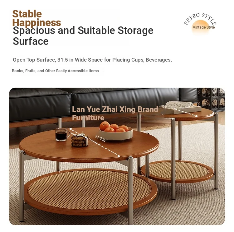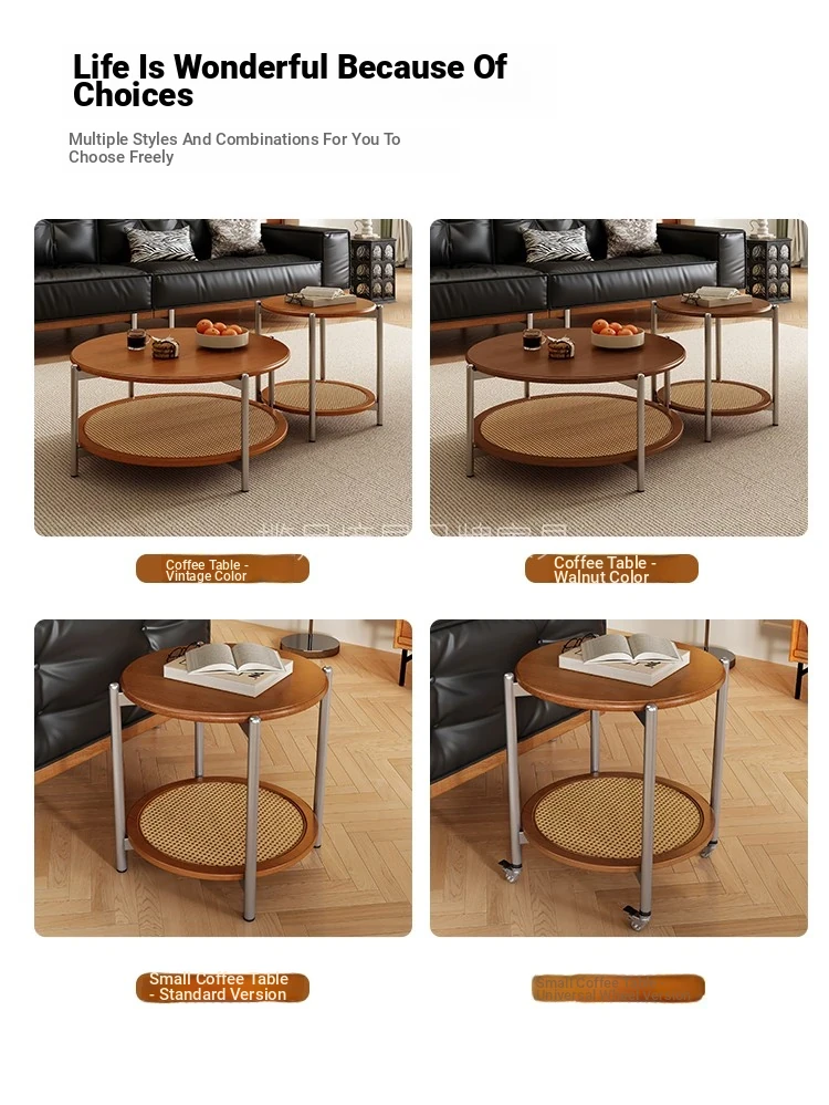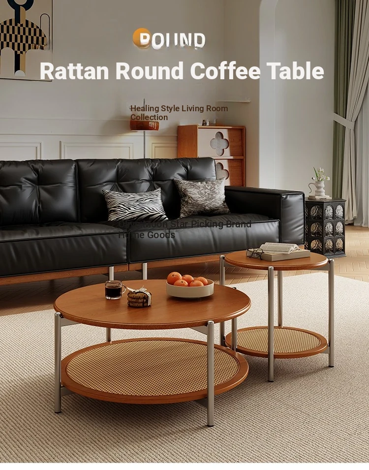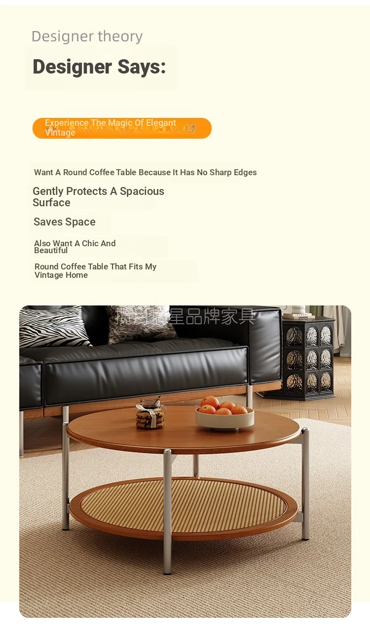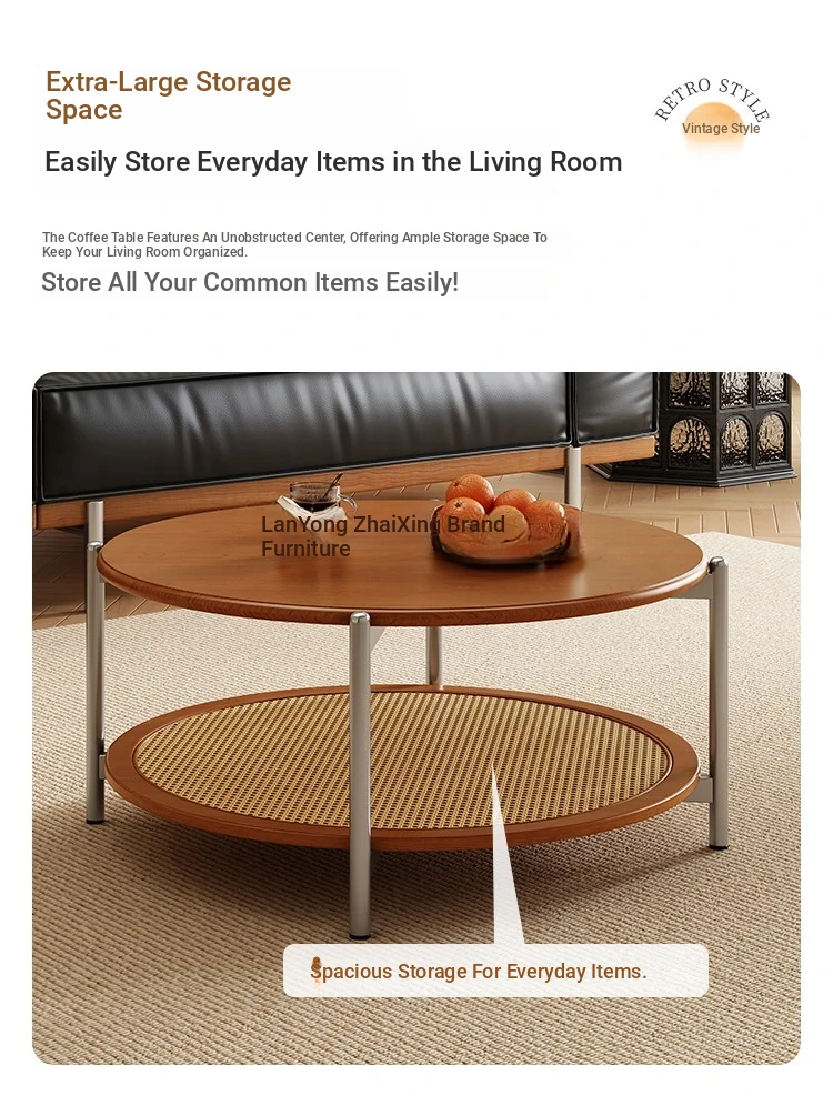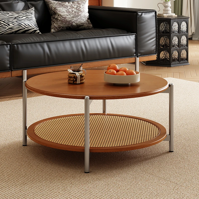 2025 New French Vintage Solid Wood Round Coffee Table - Designer Wicker Side Table for Living Room, Home Use