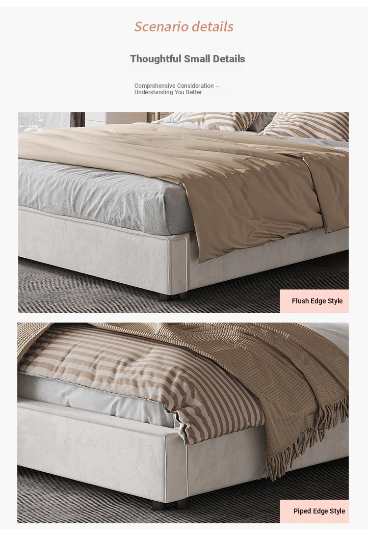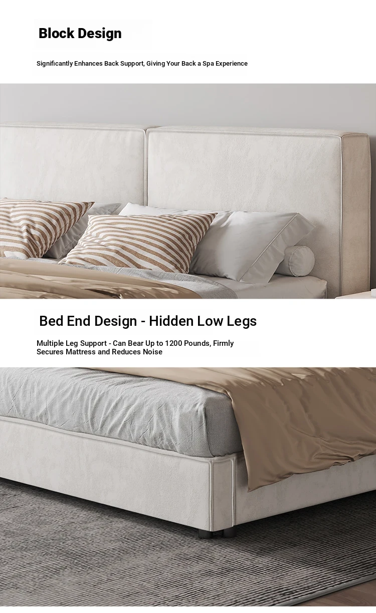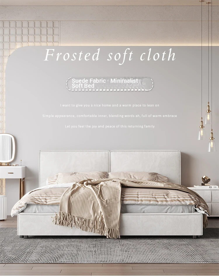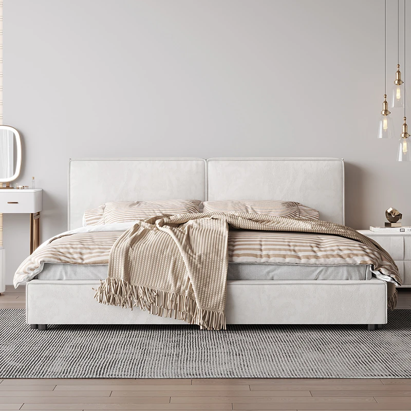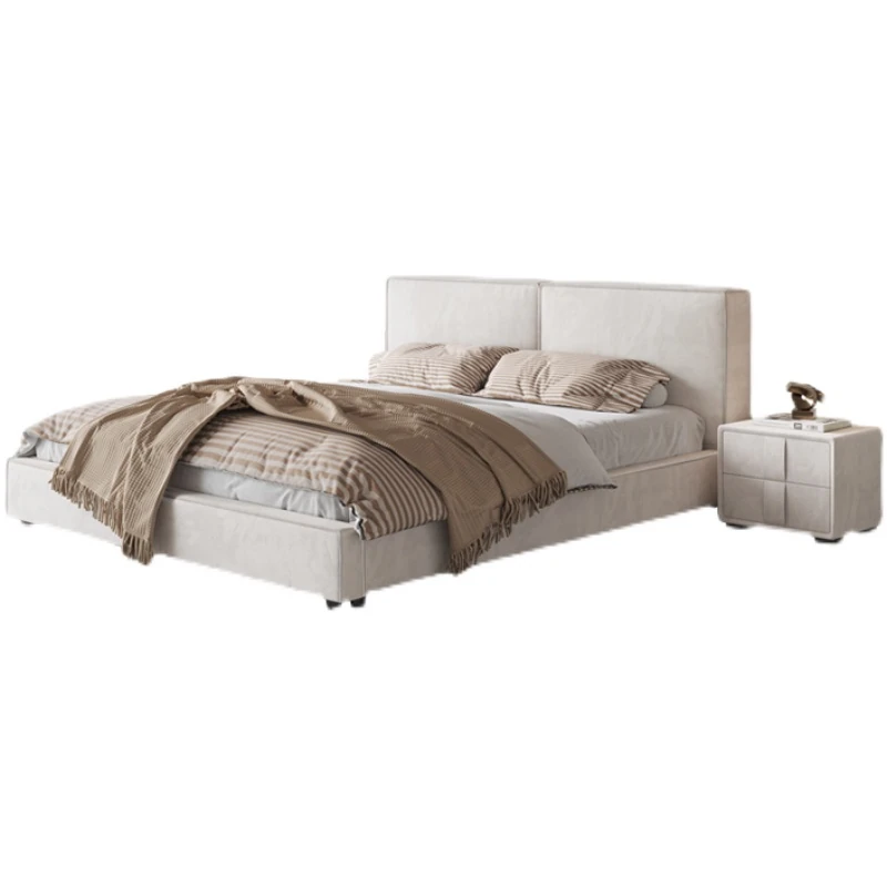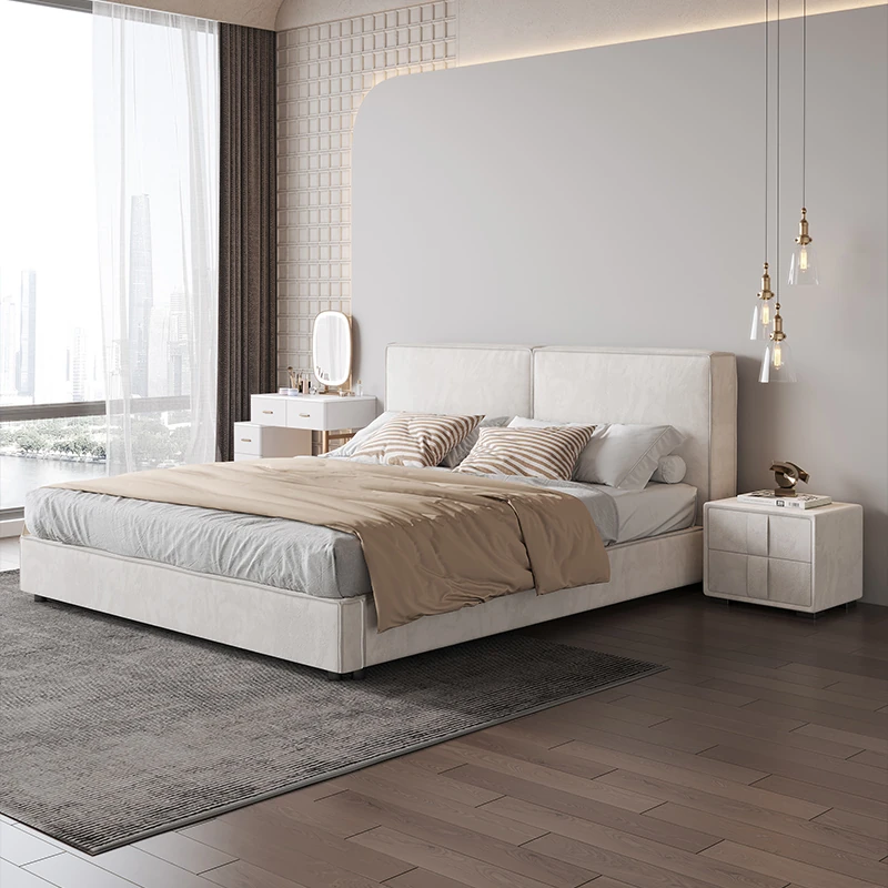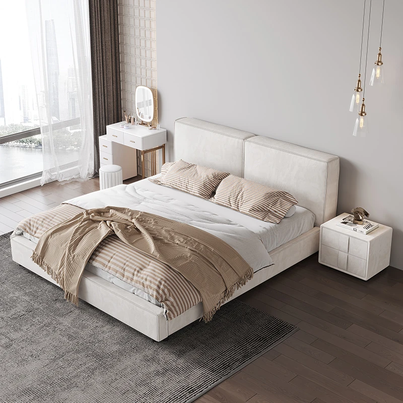 Italian Minimalist Luxury Velvet Tofu Block Bed - Chic Cream Double Bed for Master Bedroom, Perfect for Trendy Ins Aesthetics and Simplistic Elegance