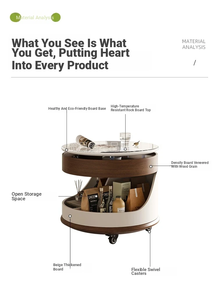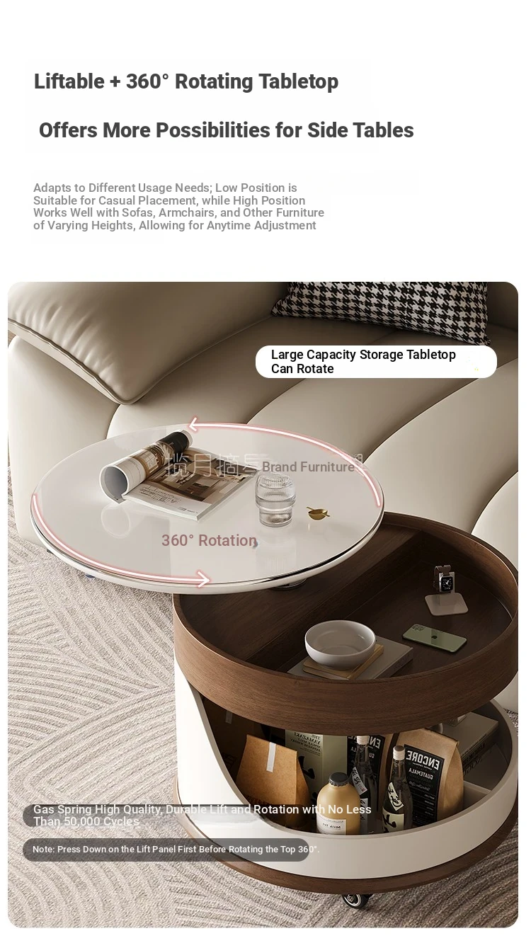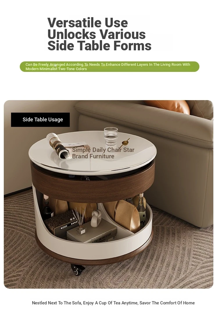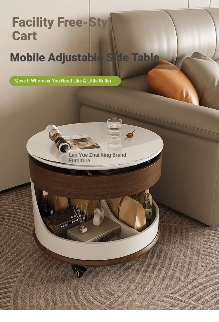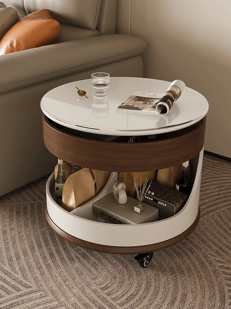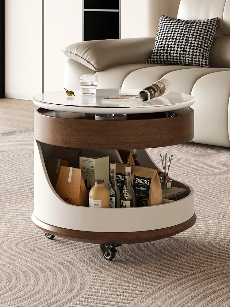 Italian Minimalist Round Movable Coffee Table - Versatile Side Table for Small Living Spaces with Adjustable Height and Storage Cart Functionality