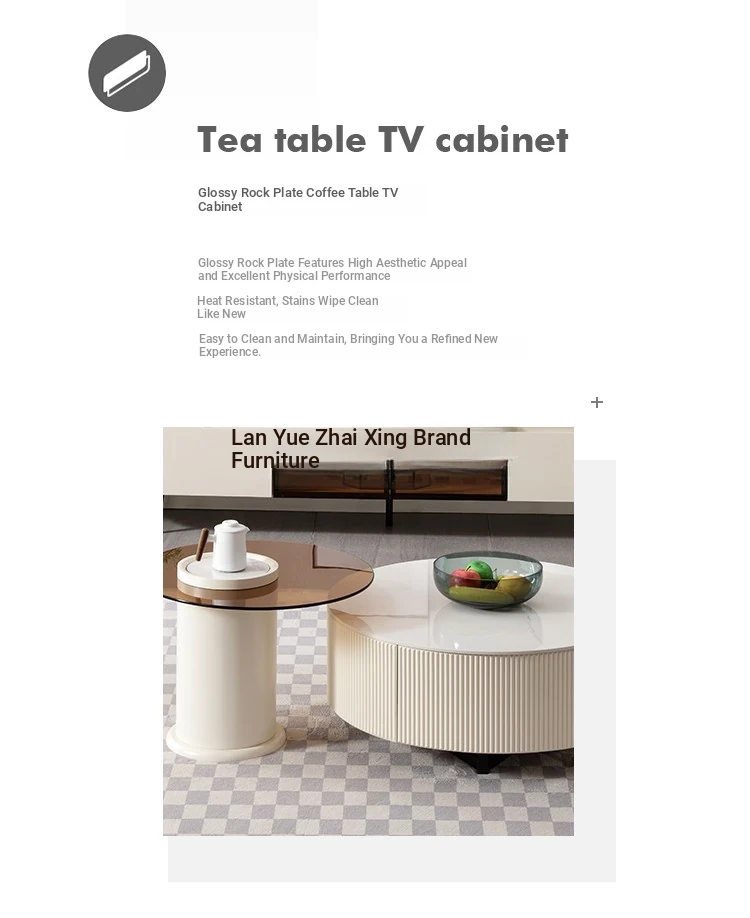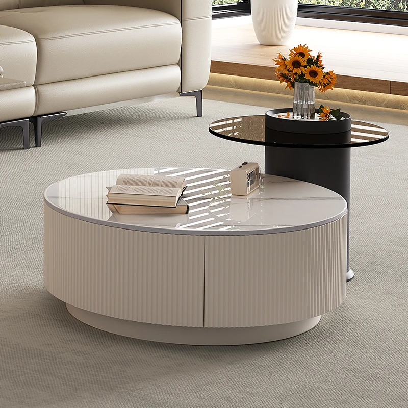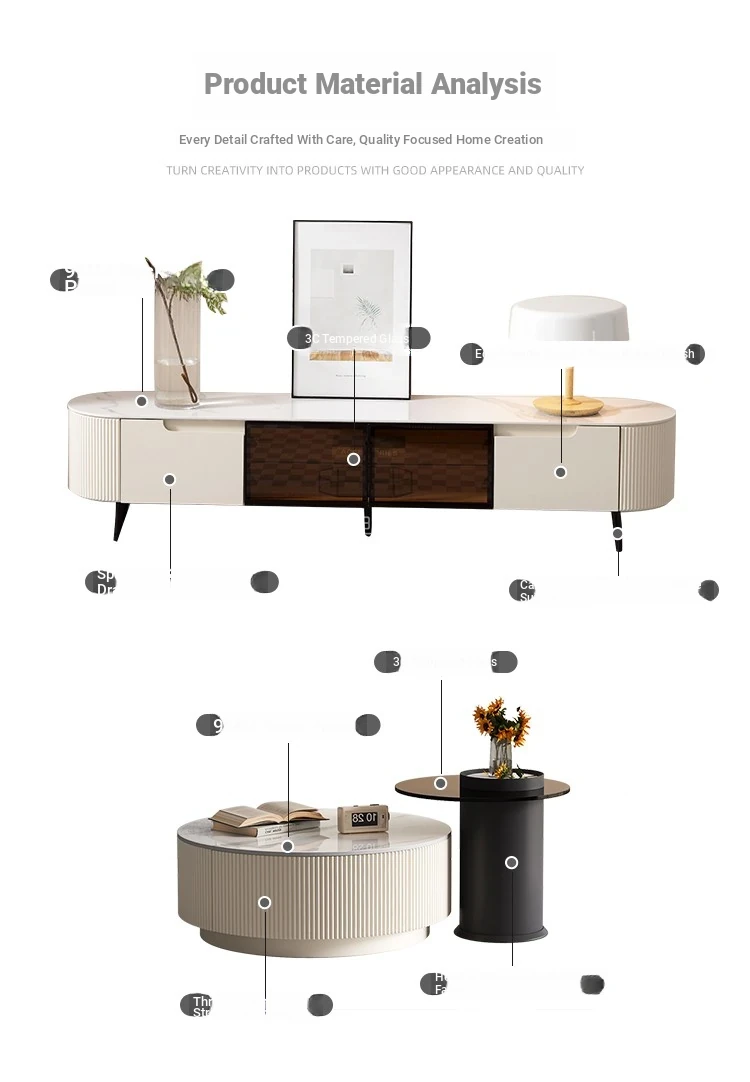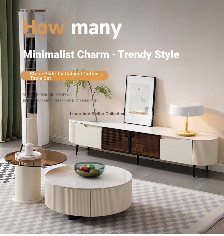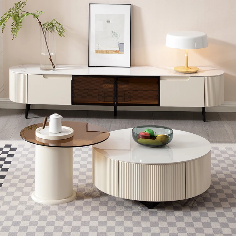 Rock Slab Tv Cabinet + Large and Small Round Coffee Table Combination [Off-White]