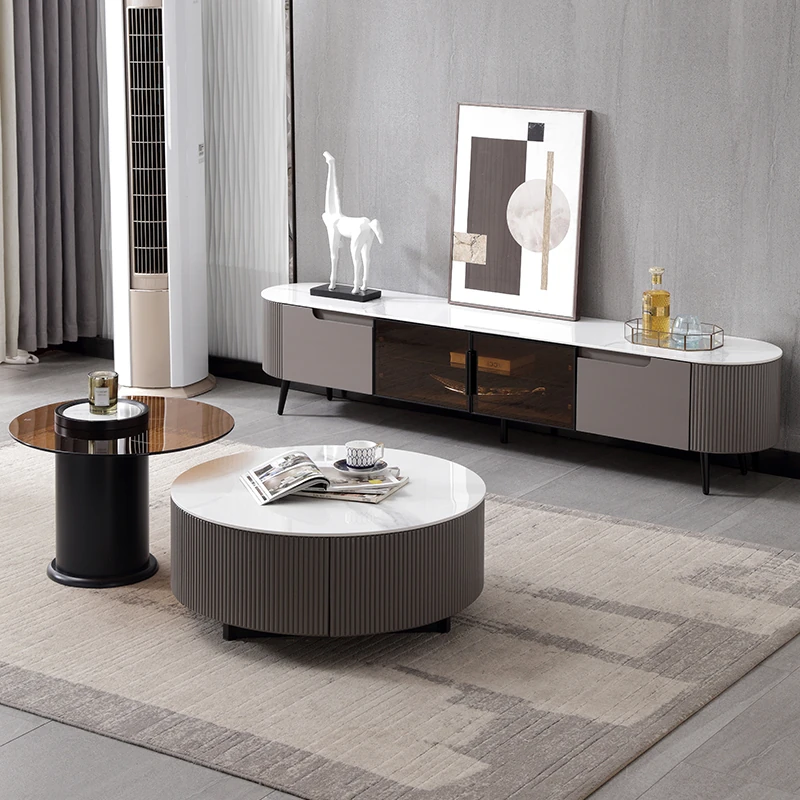 Modern Italian Minimalist High-Gloss Rock Veneer Coffee Table and TV Cabinet Set - Spacious Storage Solution for Your Contemporary Living Room
