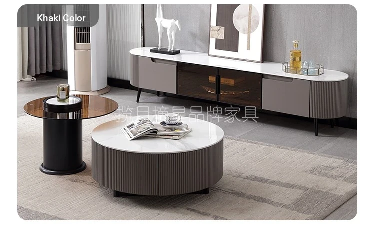 Slate Tv Cabinet + Large and Small Round Coffee Table Combination [Khaki Color]