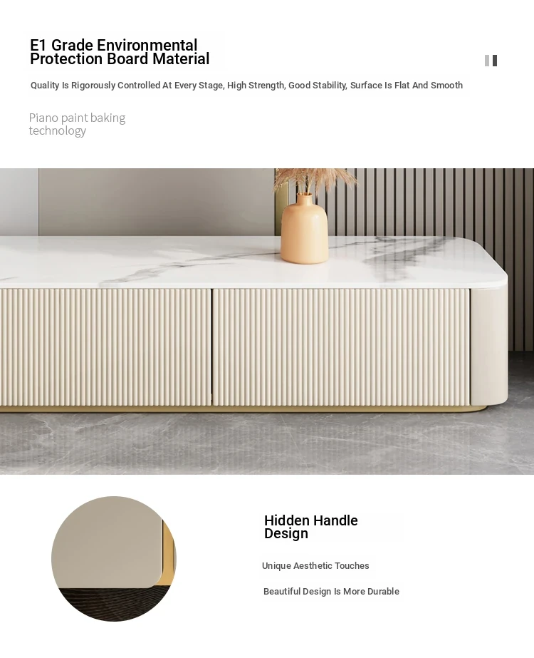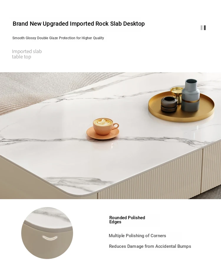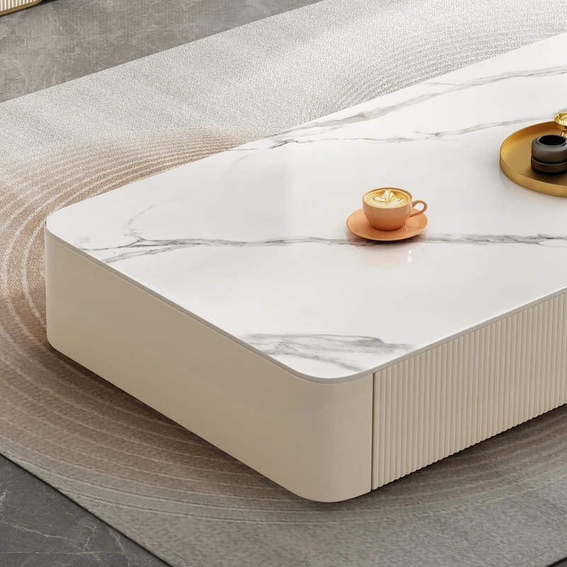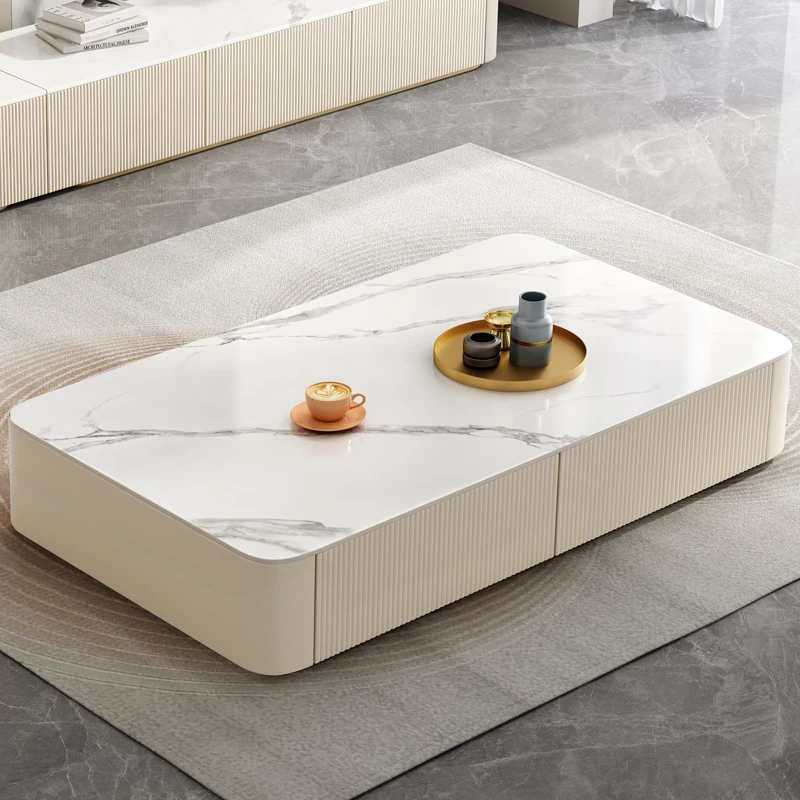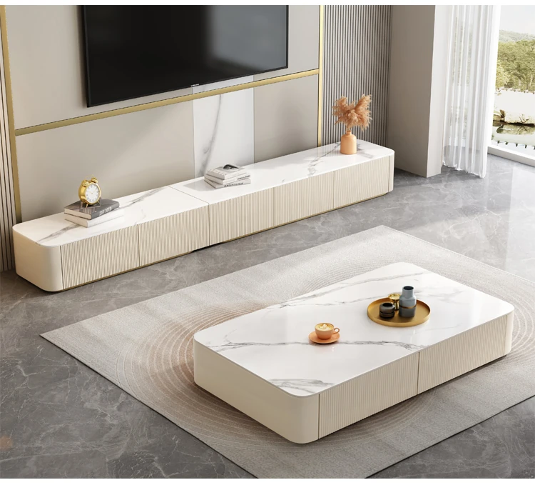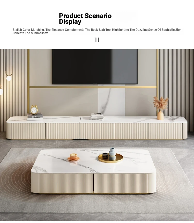 Stylish Italian Minimalist Cream Glossy Rock Panel Coffee Table and TV Cabinet Set with Floor Drawers for Ample Storage – Trendy Snow Mountain Stone Design
