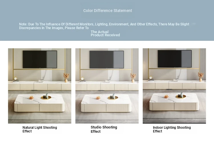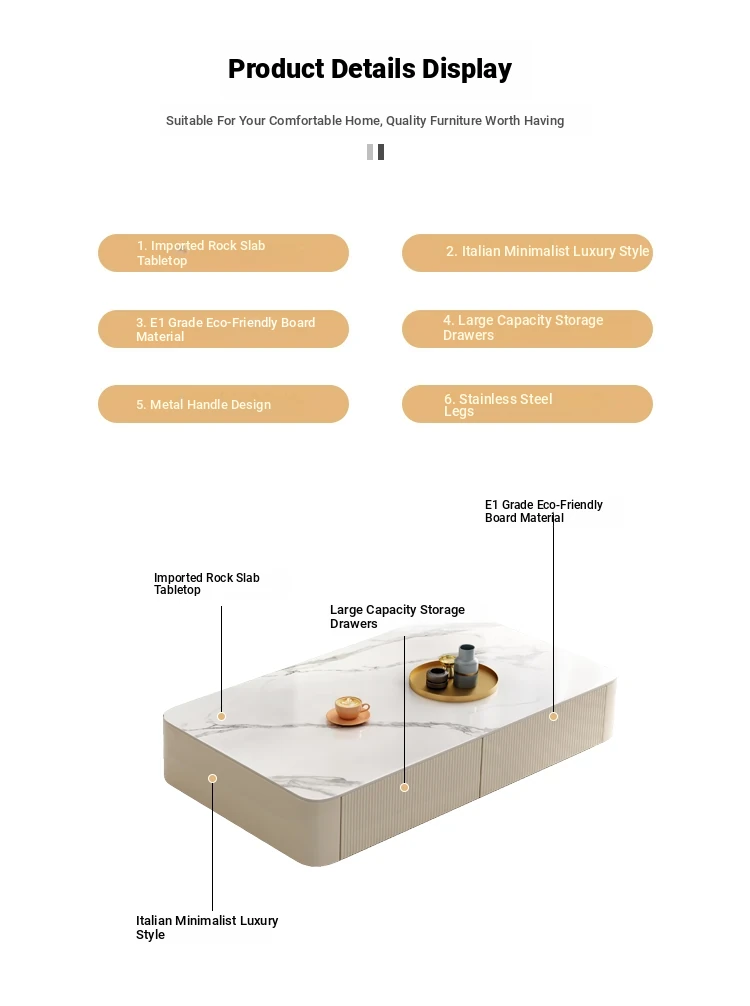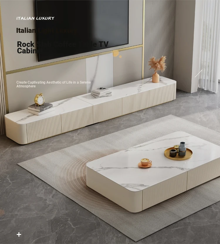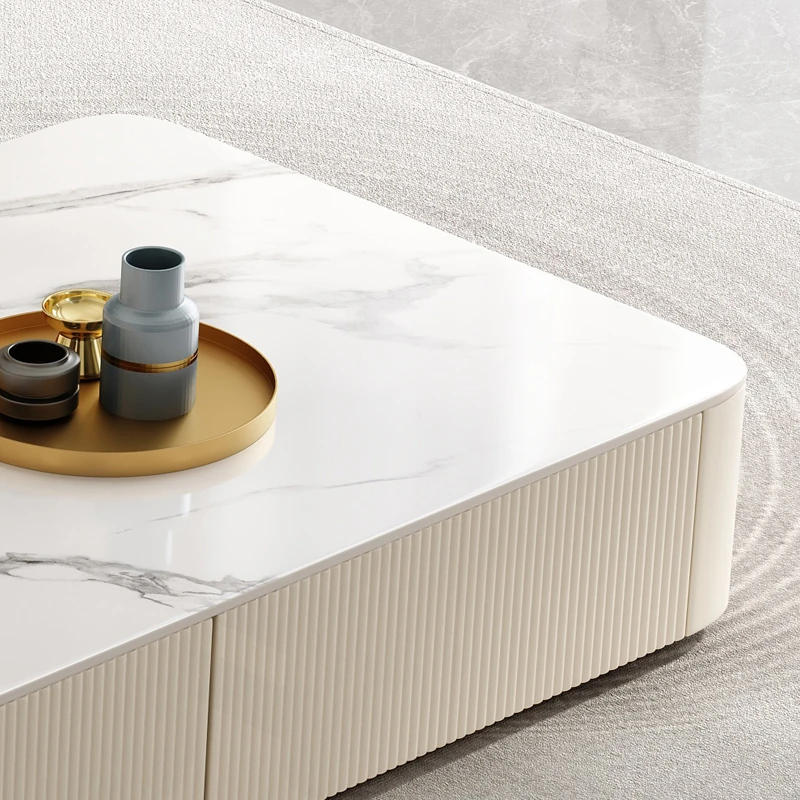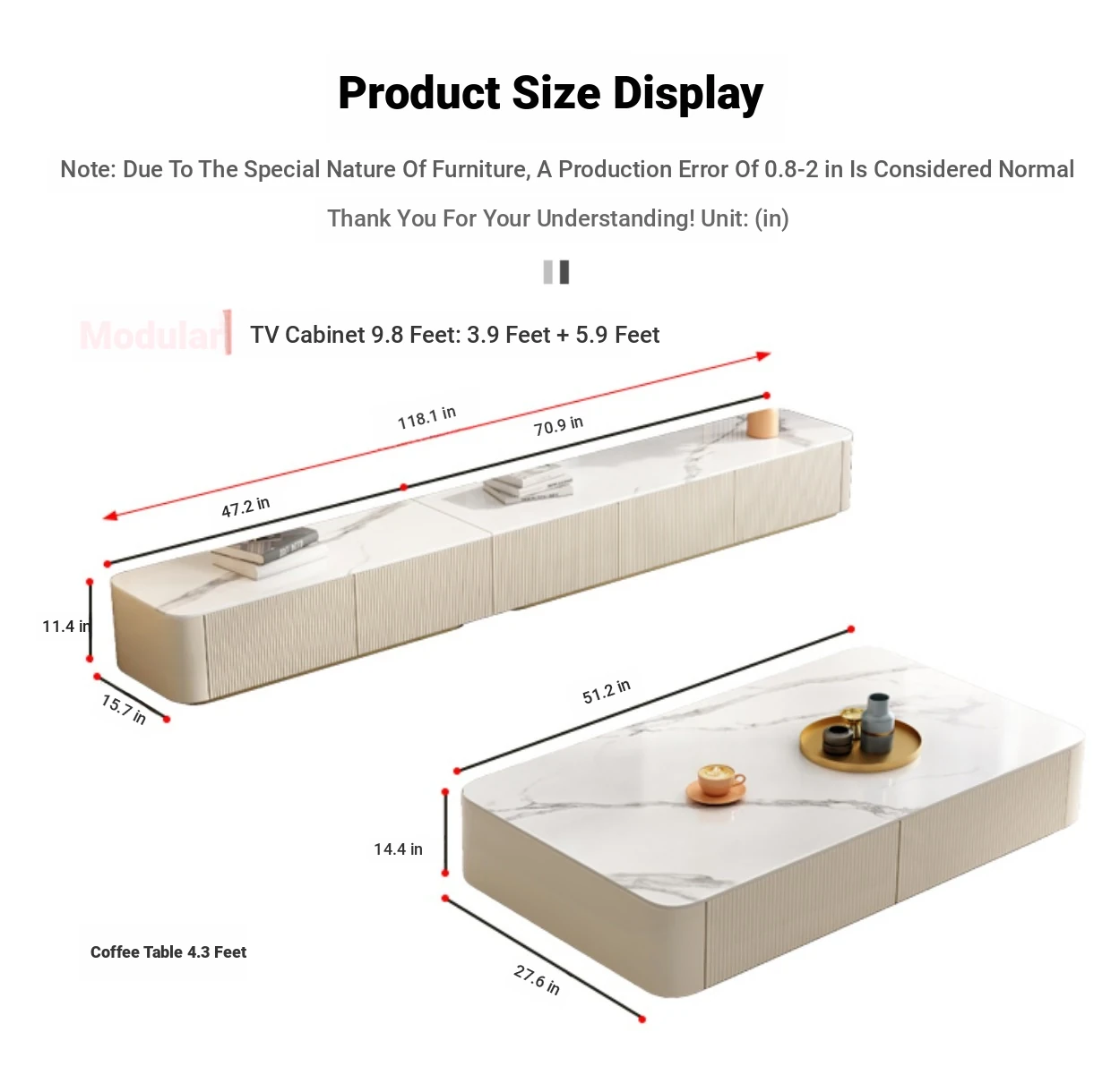 Stylish Italian Minimalist Cream Glossy Rock Panel Coffee Table and TV Cabinet Set with Floor Drawers for Ample Storage – Trendy Snow Mountain Stone Design