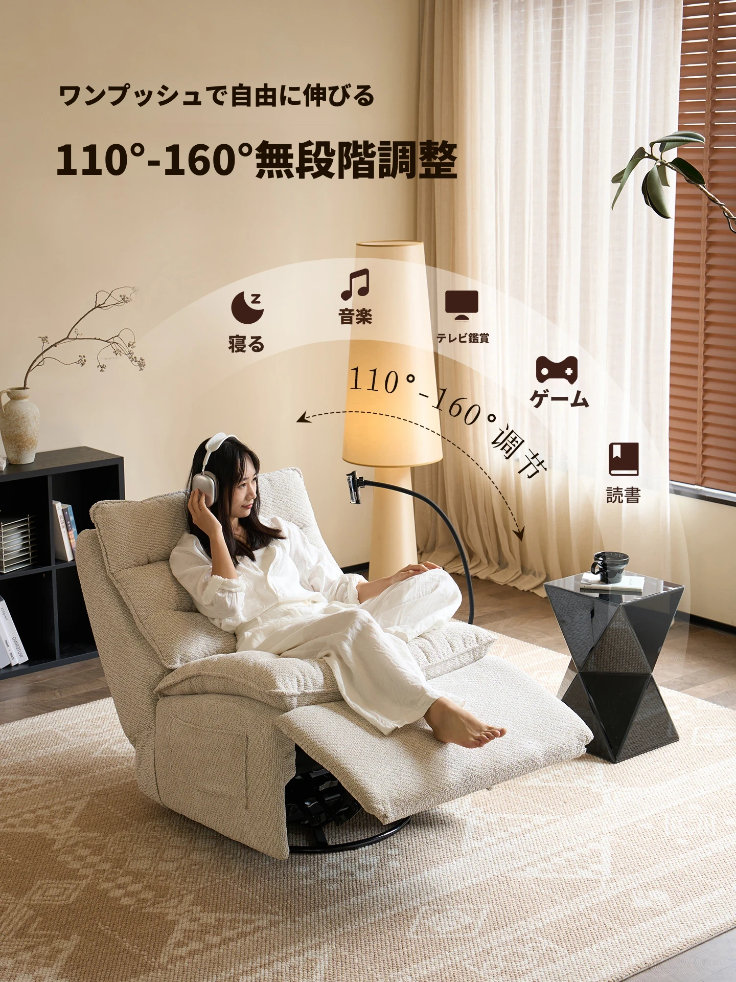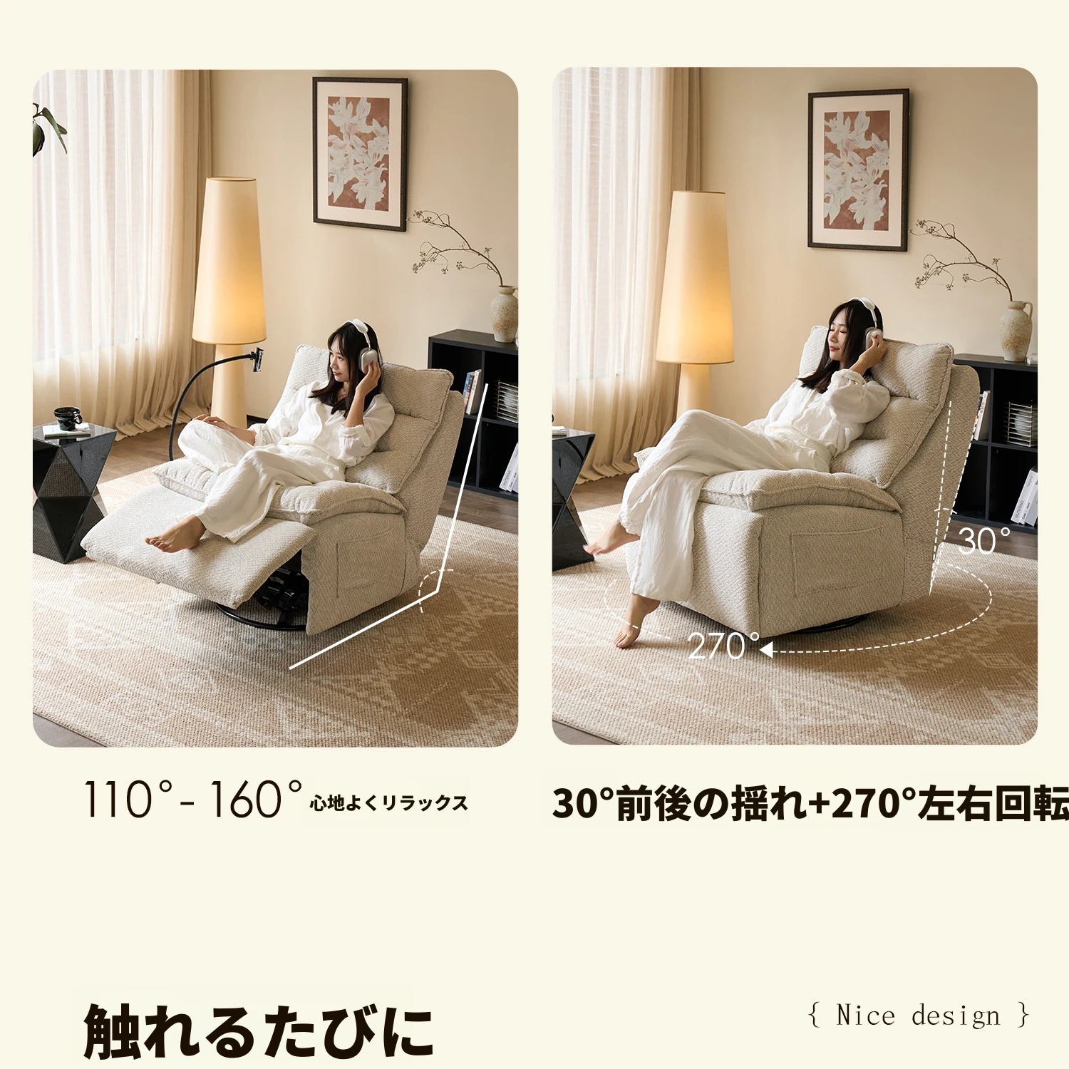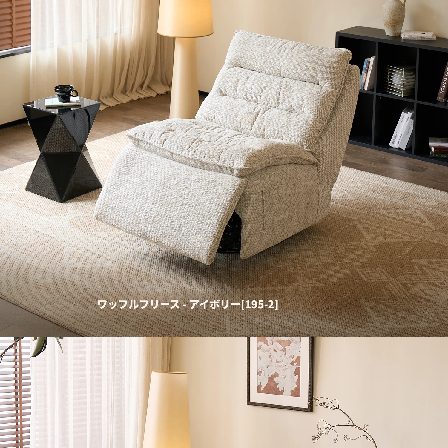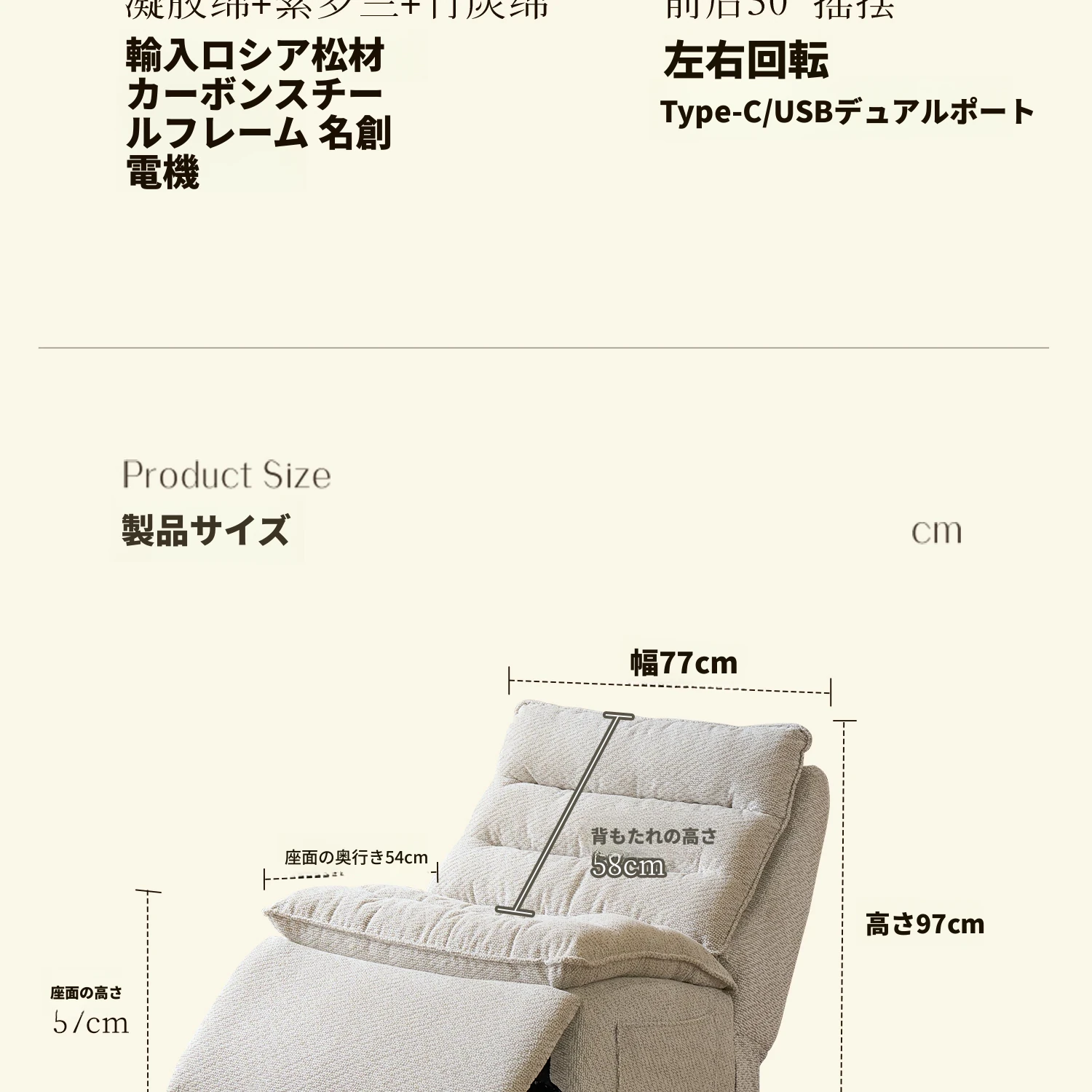 カサチの一人掛けソファ、リクライニング機能付きで寝転びも可能!小さなリビングにぴったりな侘び寂び風デザインのロッキングチェア、リラックスのための電動機能も完備!