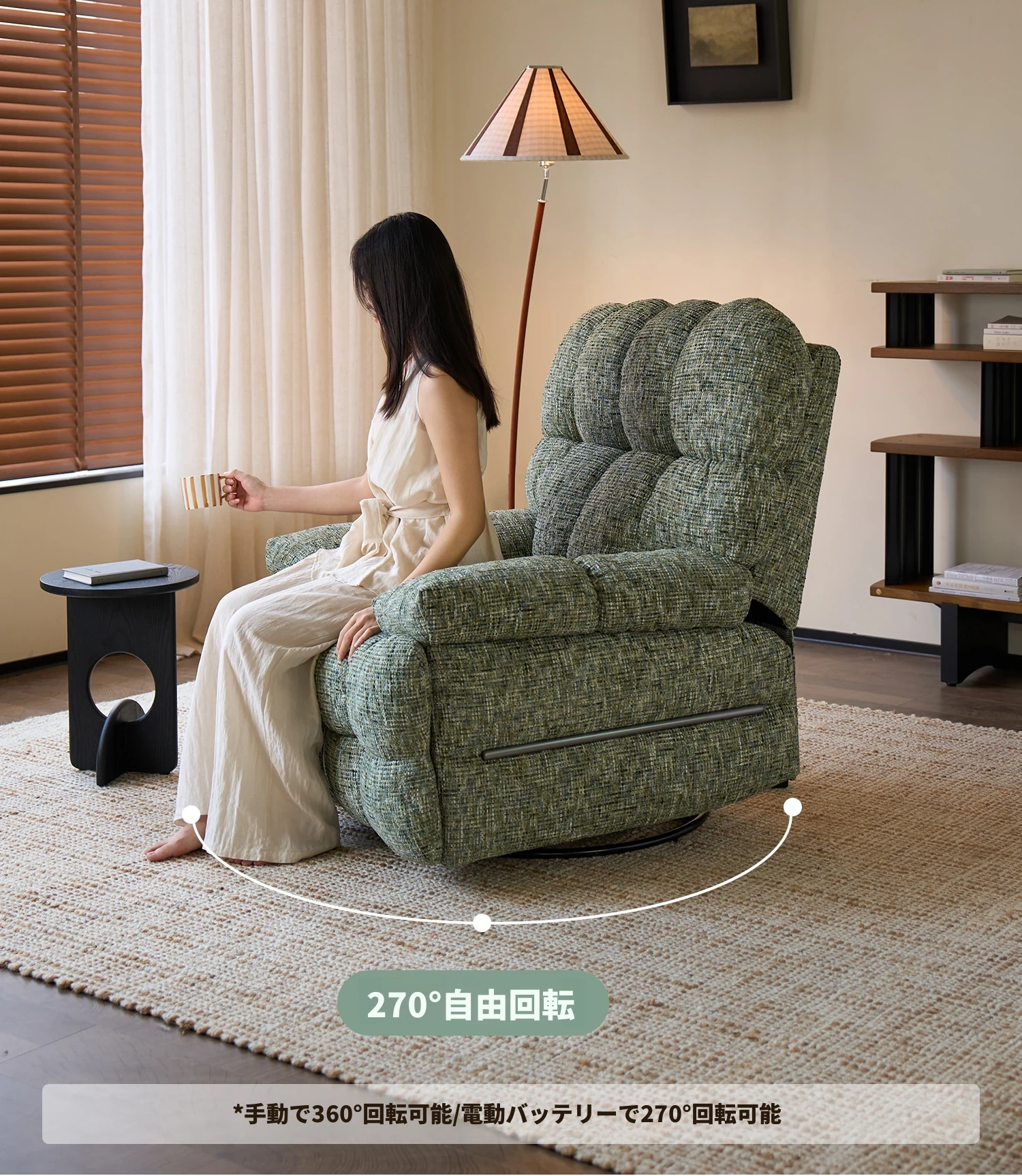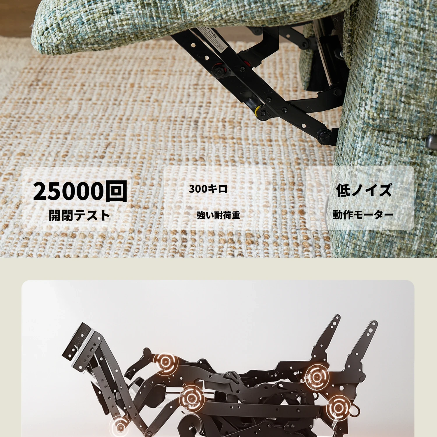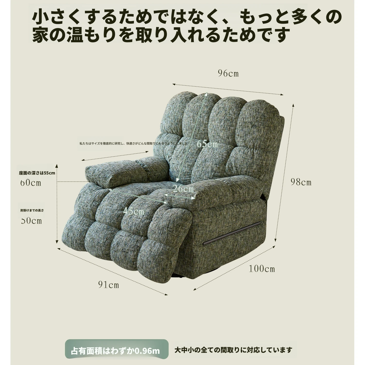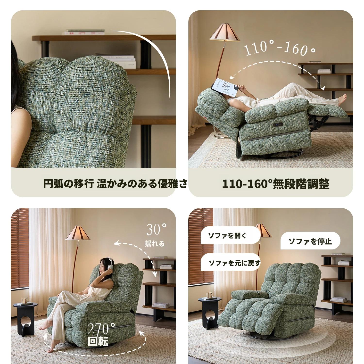 カサーチコットンリネン一人掛けソファ、リラックスできる多機能電動タイプ。包み込まれるような快適さとゼロ重力体験を実現した、エコで心地良いグリーンファブリックです!