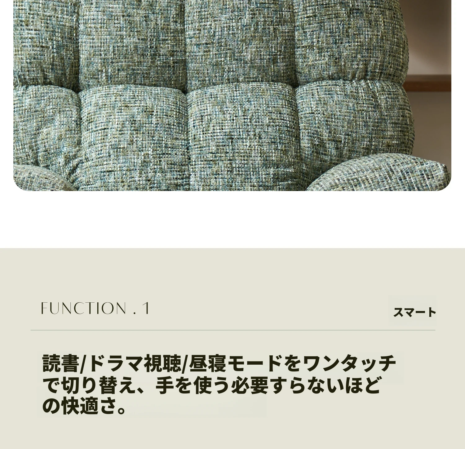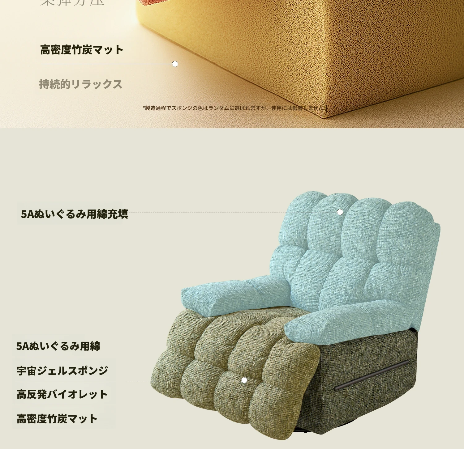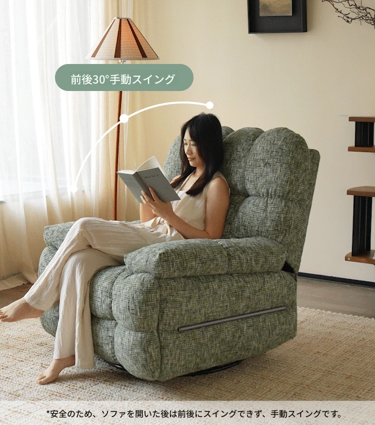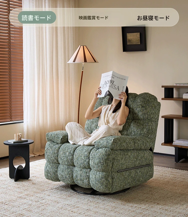 カサーチコットンリネン一人掛けソファ、リラックスできる多機能電動タイプ。包み込まれるような快適さとゼロ重力体験を実現した、エコで心地良いグリーンファブリックです!