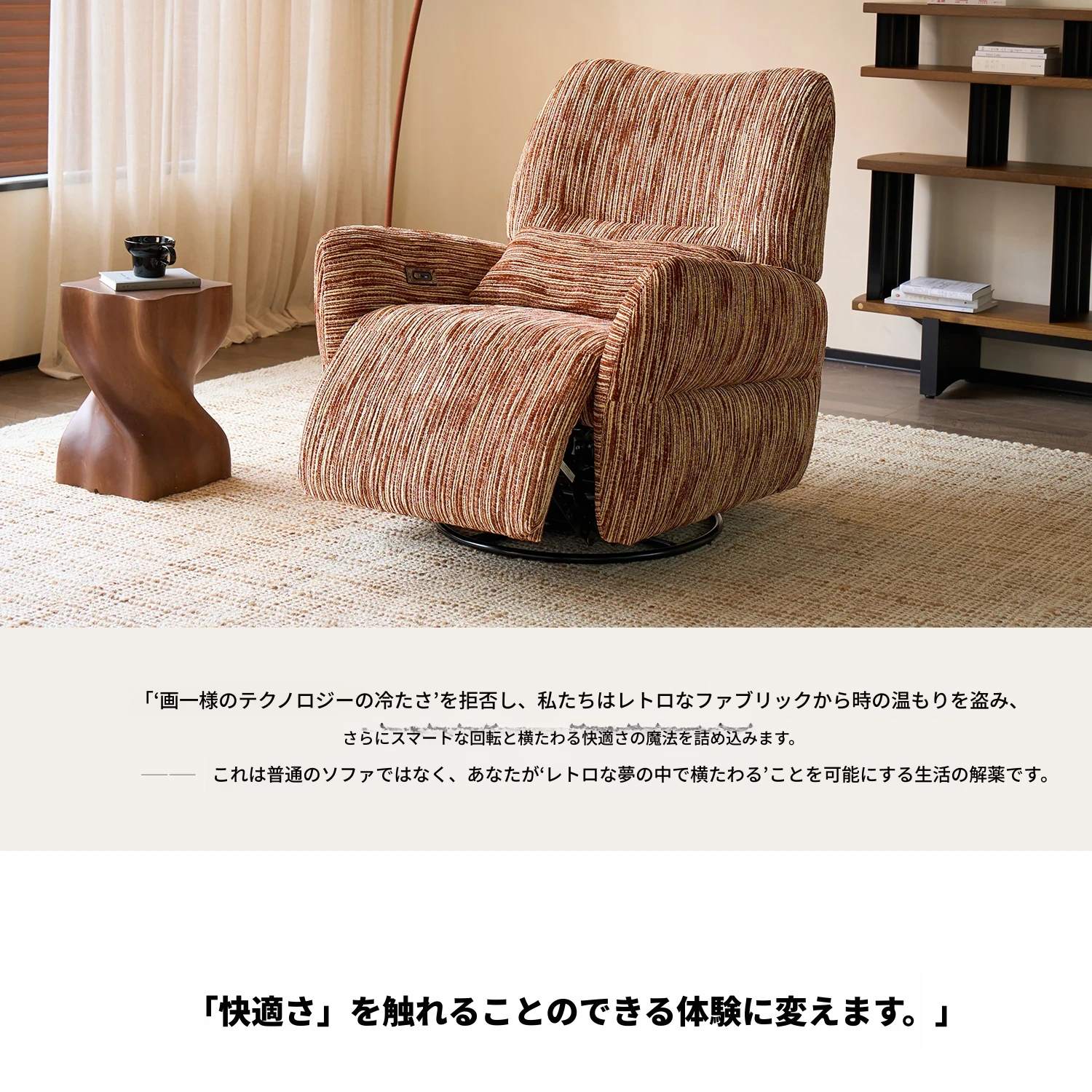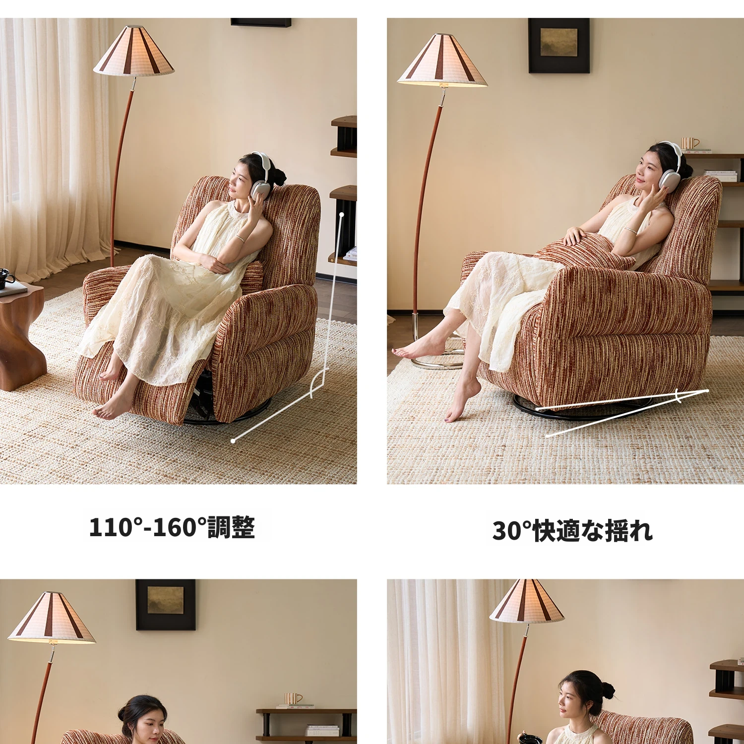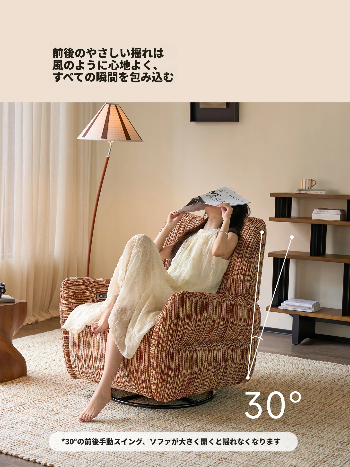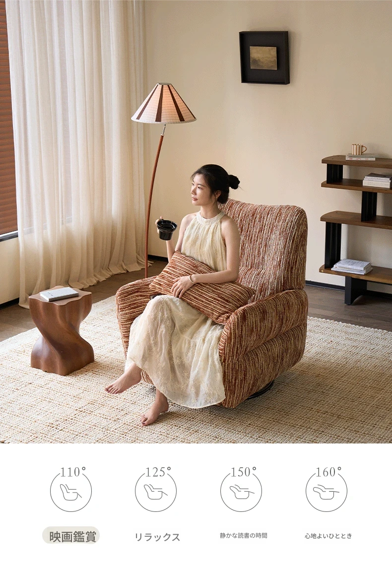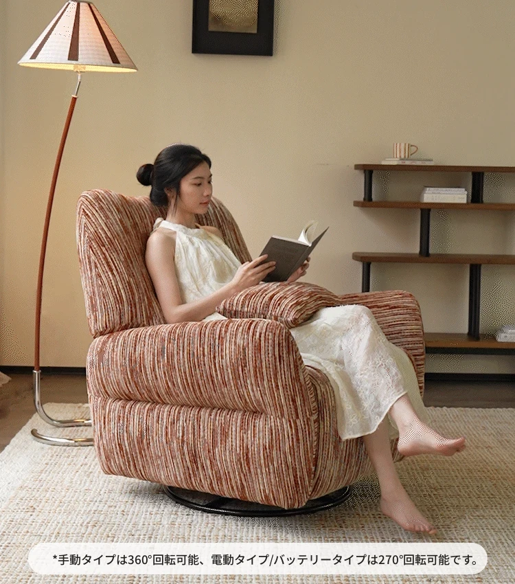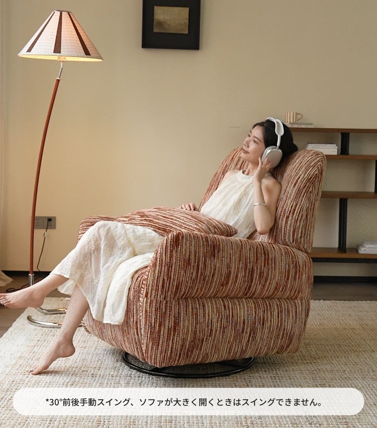 カサチ復古スタイル一人用ソファー、リラックスできるフラット機能付き!スノーニール生地で、コンパクトな空間に最適な電動ロッキングチェア。快適な座り心地で、毎日の疲れを癒します。