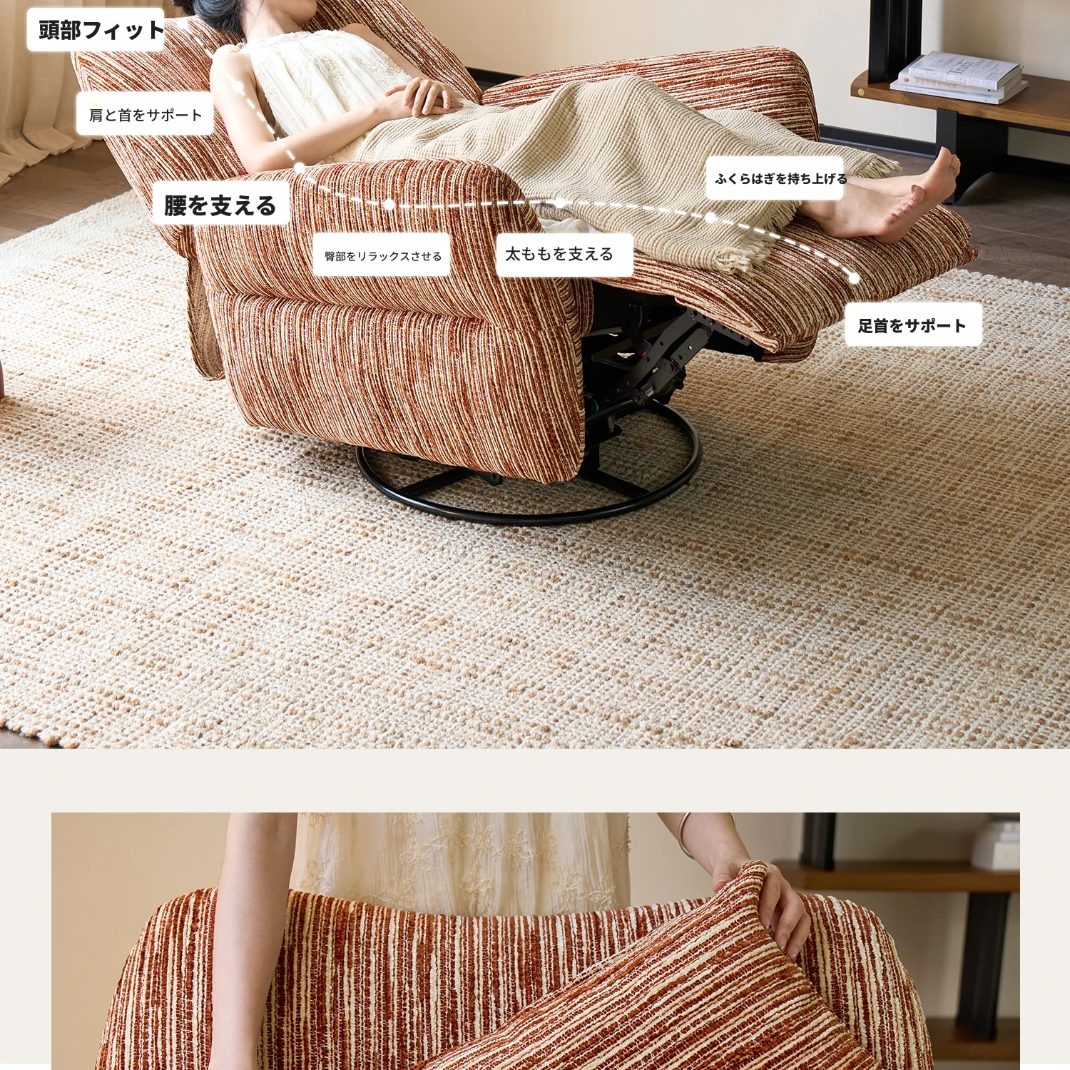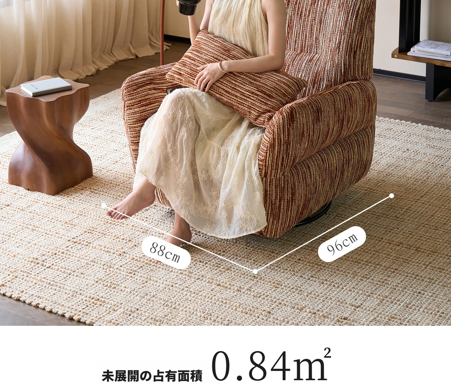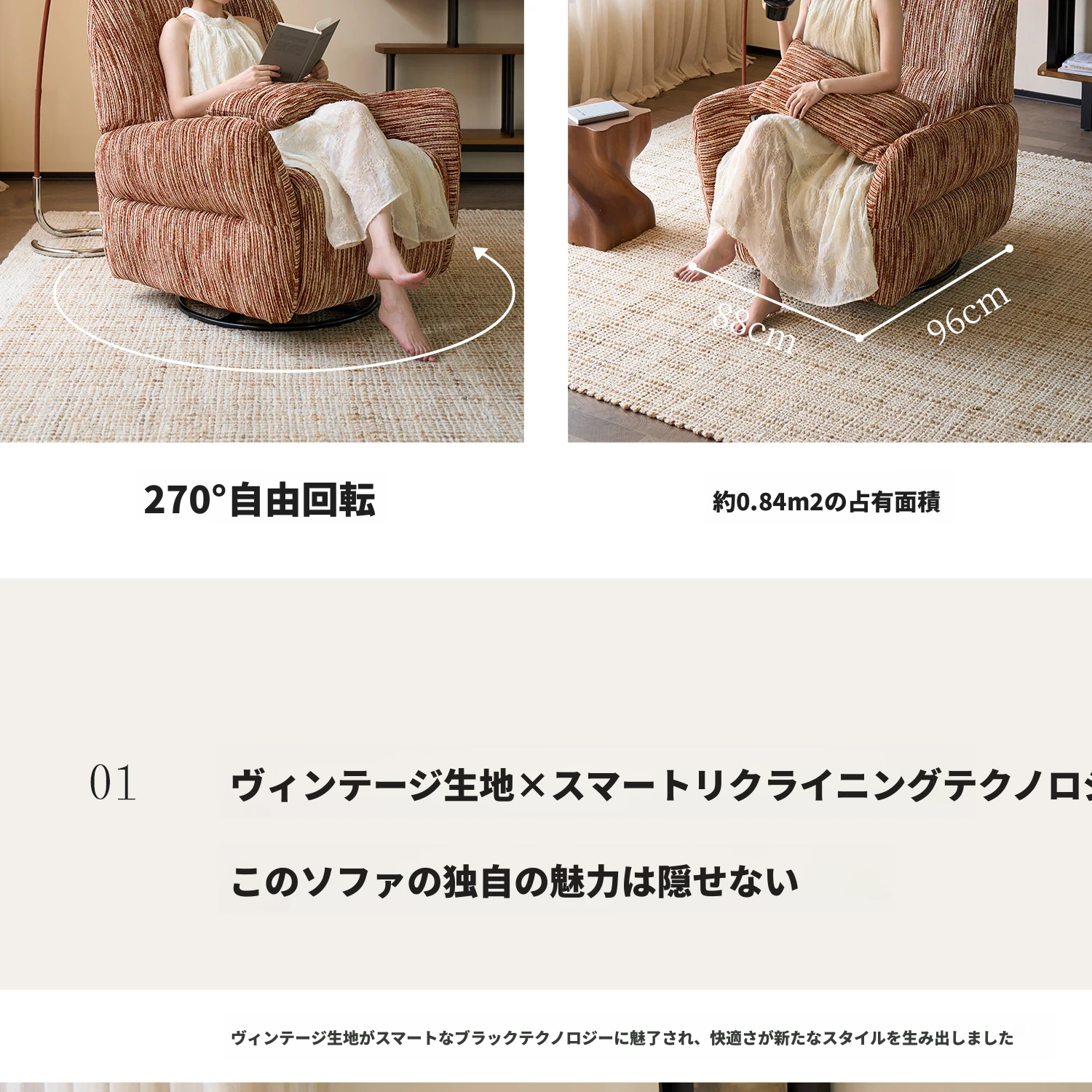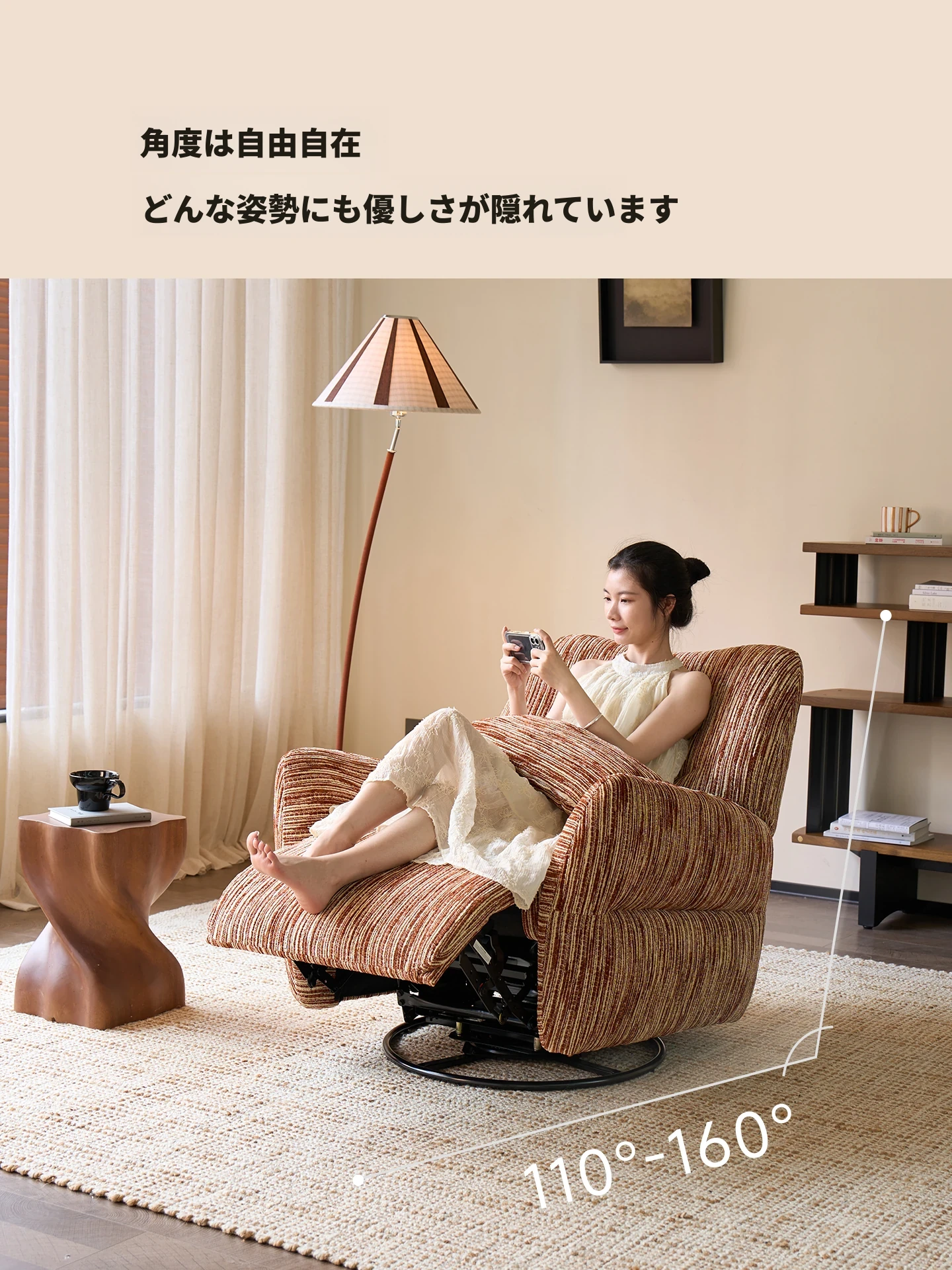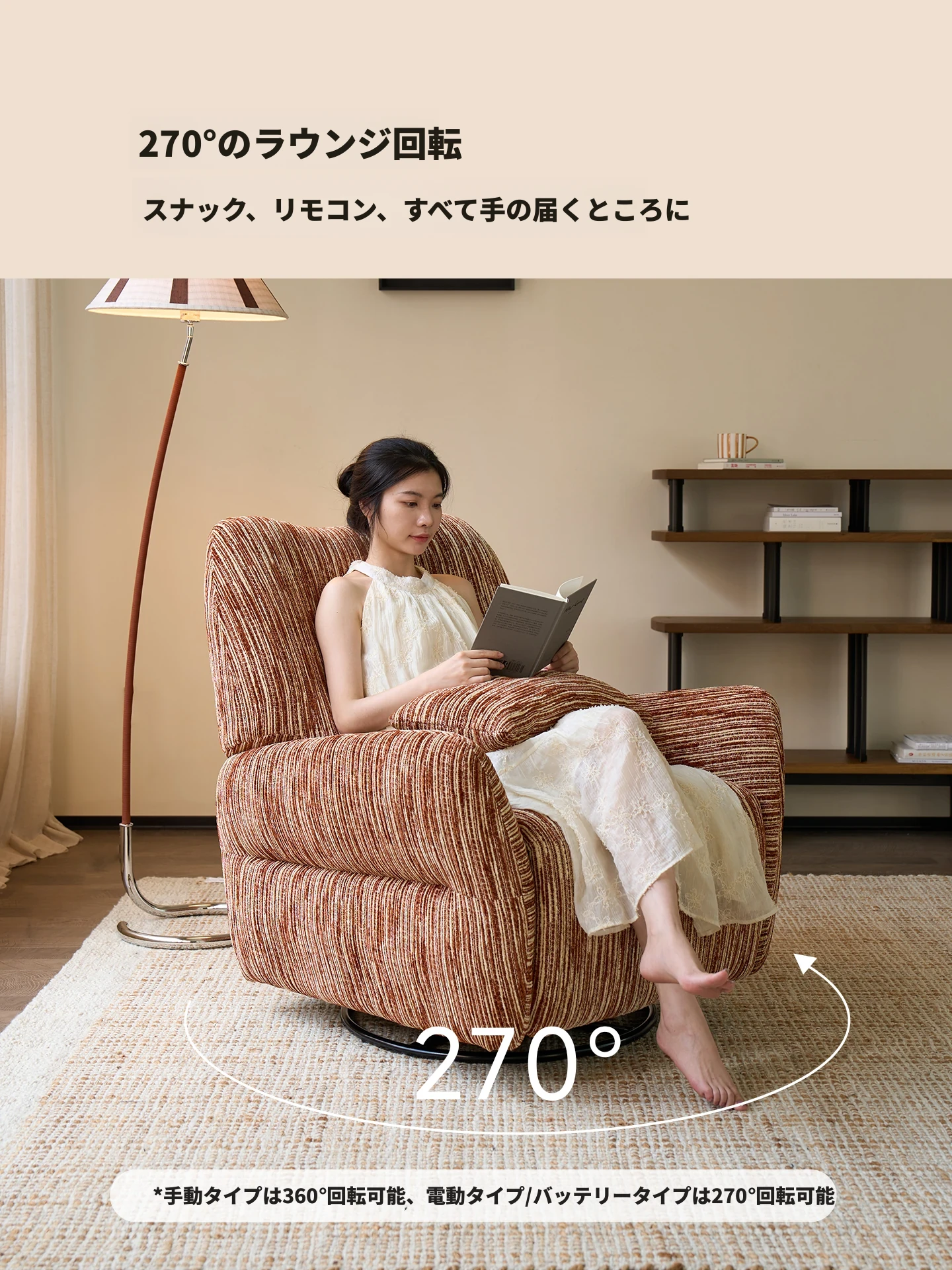 カサチ復古スタイル一人用ソファー、リラックスできるフラット機能付き!スノーニール生地で、コンパクトな空間に最適な電動ロッキングチェア。快適な座り心地で、毎日の疲れを癒します。