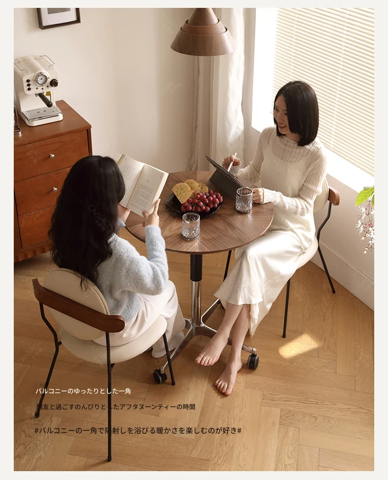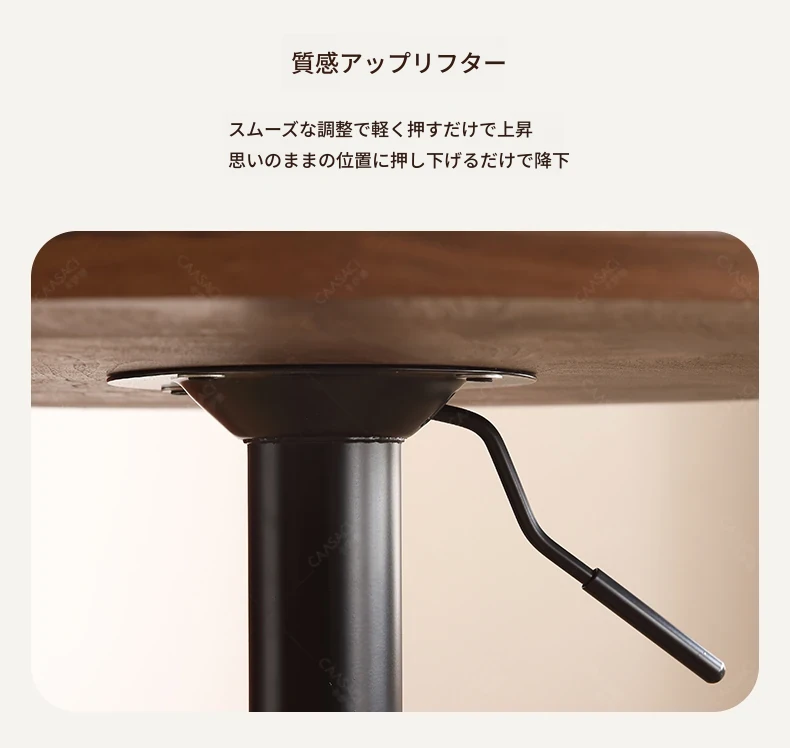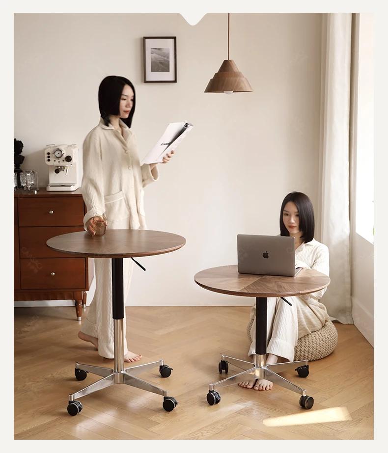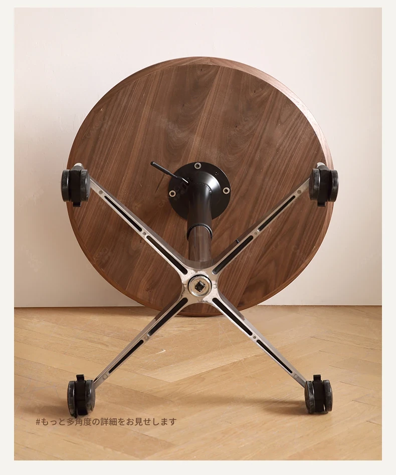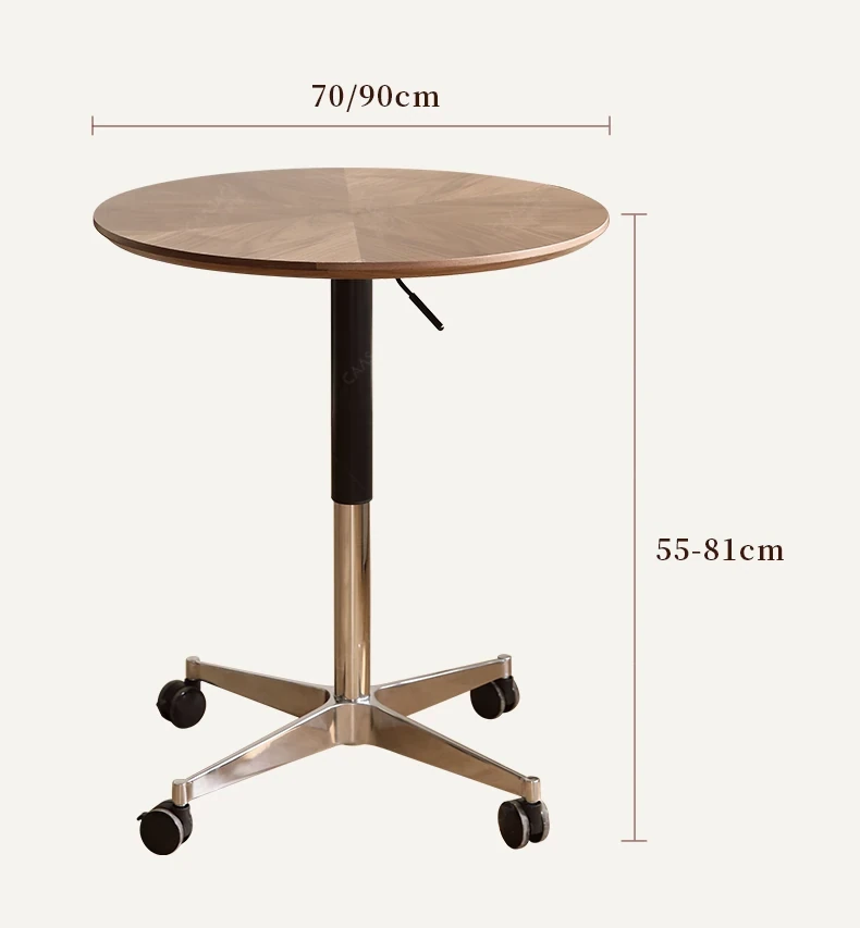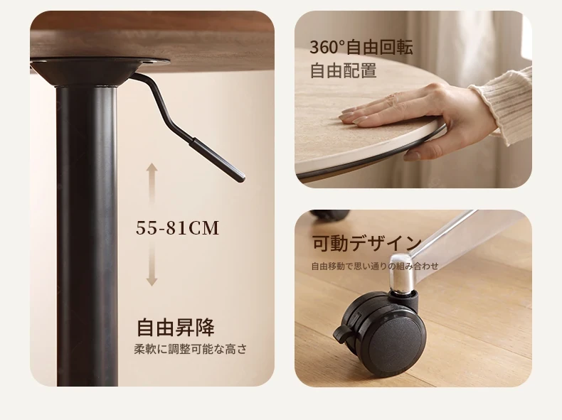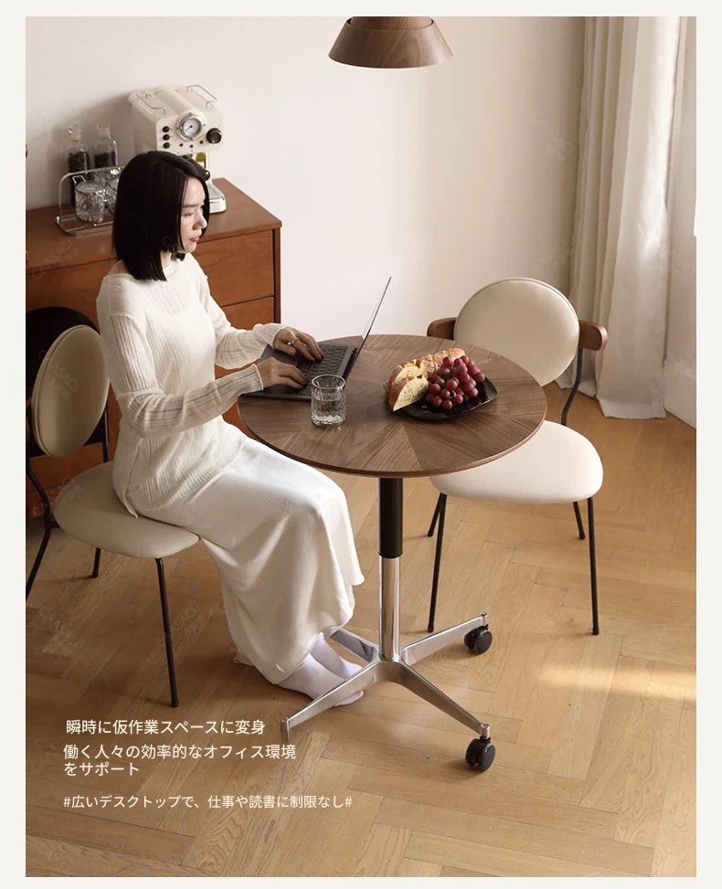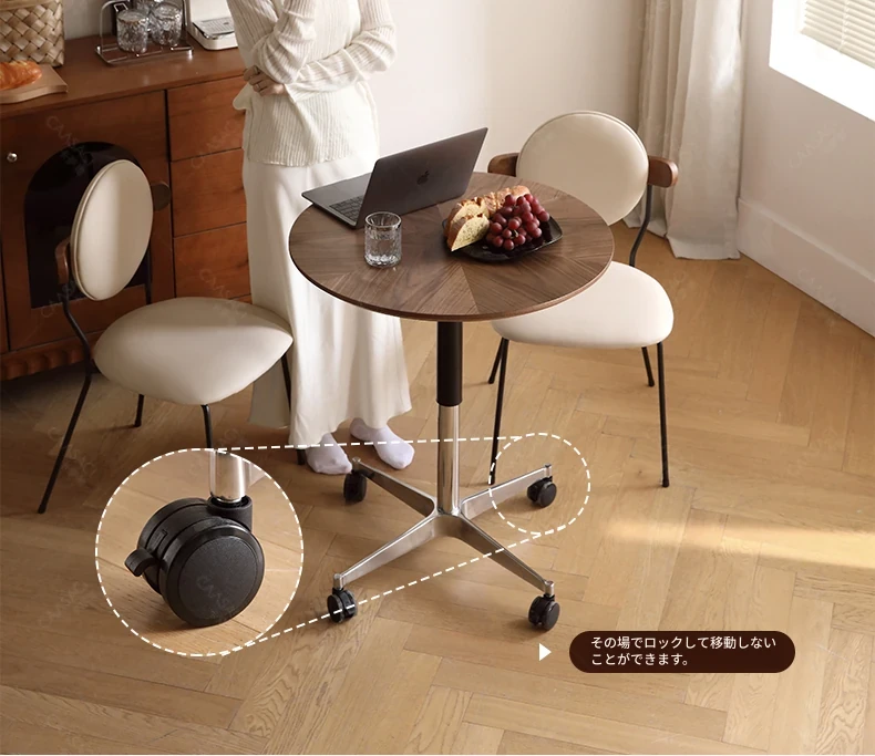 カサチの無垢材昇降テーブル - 北欧スタイルの小型住宅にぴったり!キャスター付きで移動も簡単な丸型サイドテーブル、リビングに華やかさをプラス。