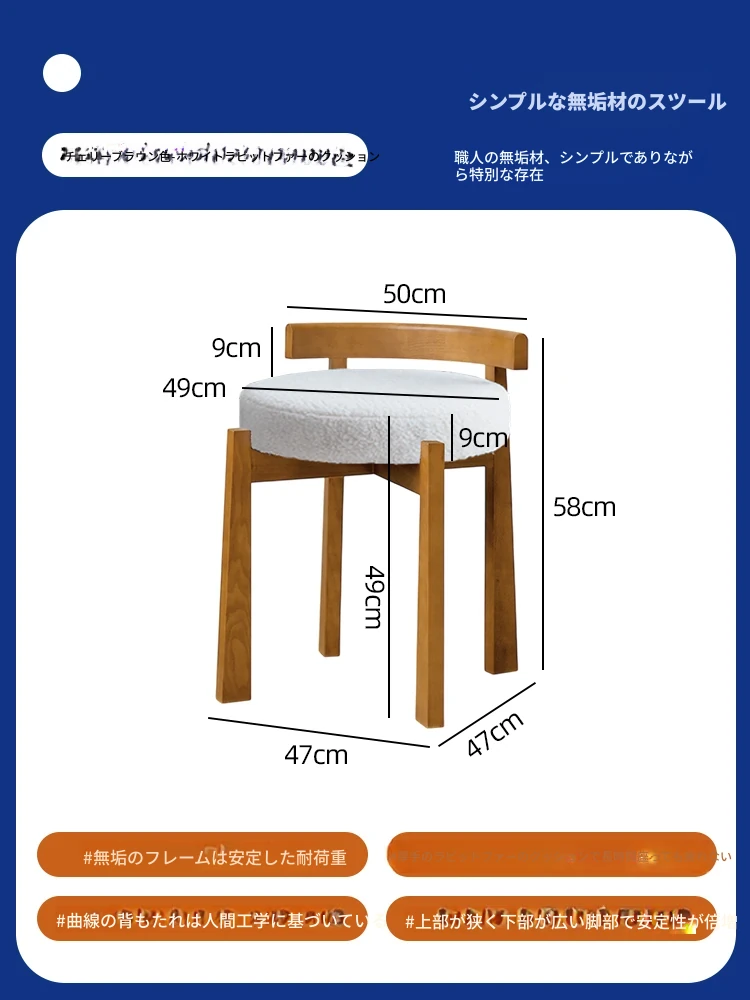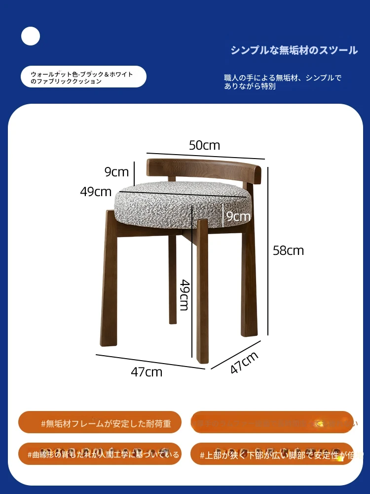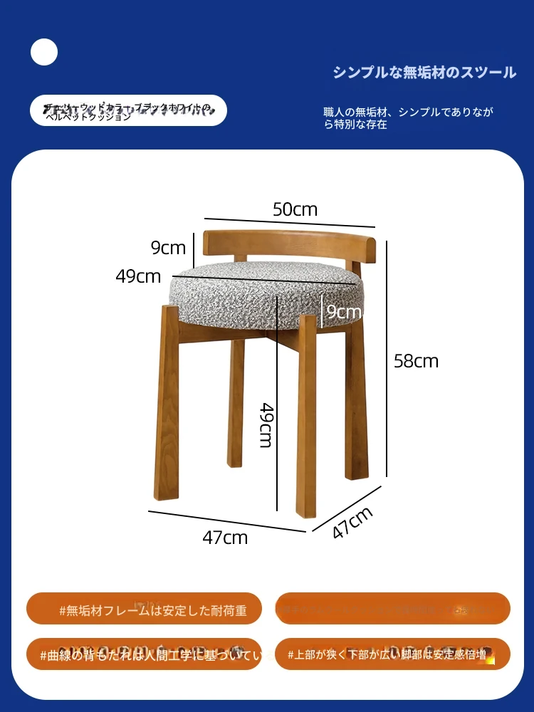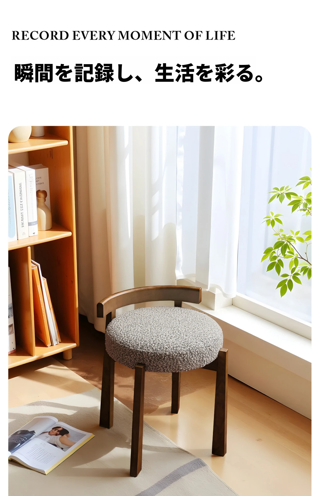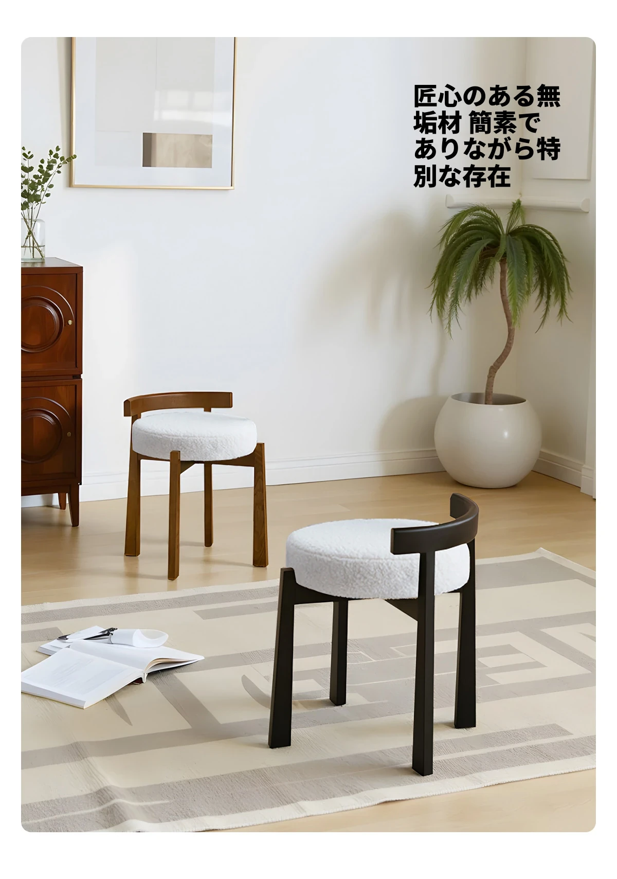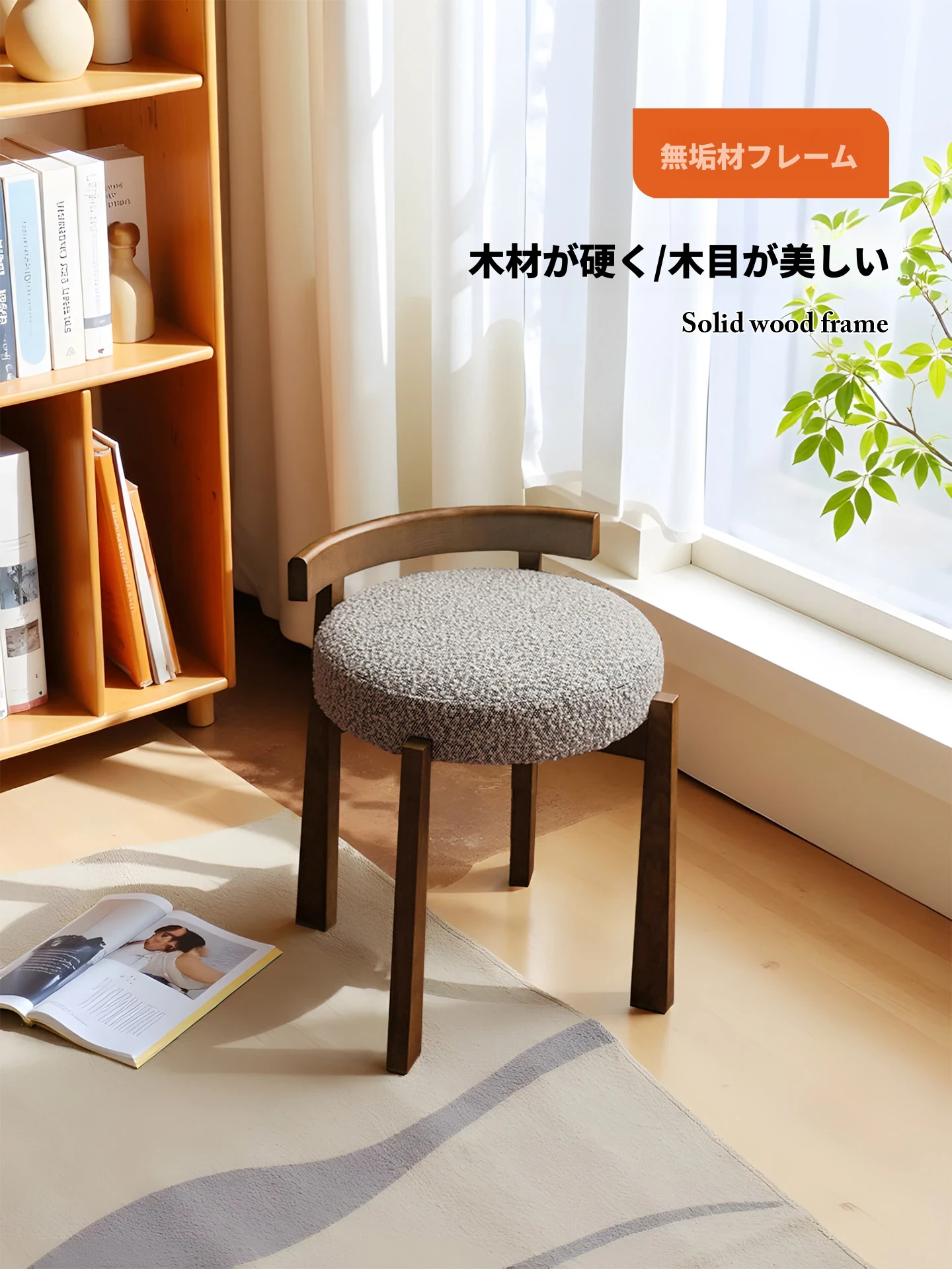 アイセンロントの無垢材を使用したヴィンテージ風メイクアップスツール!省スペース設計で、女性の寝室にぴったり。柔らかなクッション付きで、美容やネイルにも最適なラウンドドレッシングチェア!