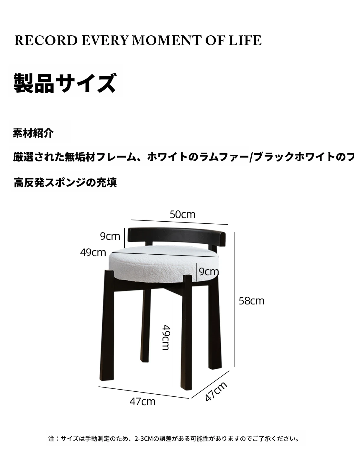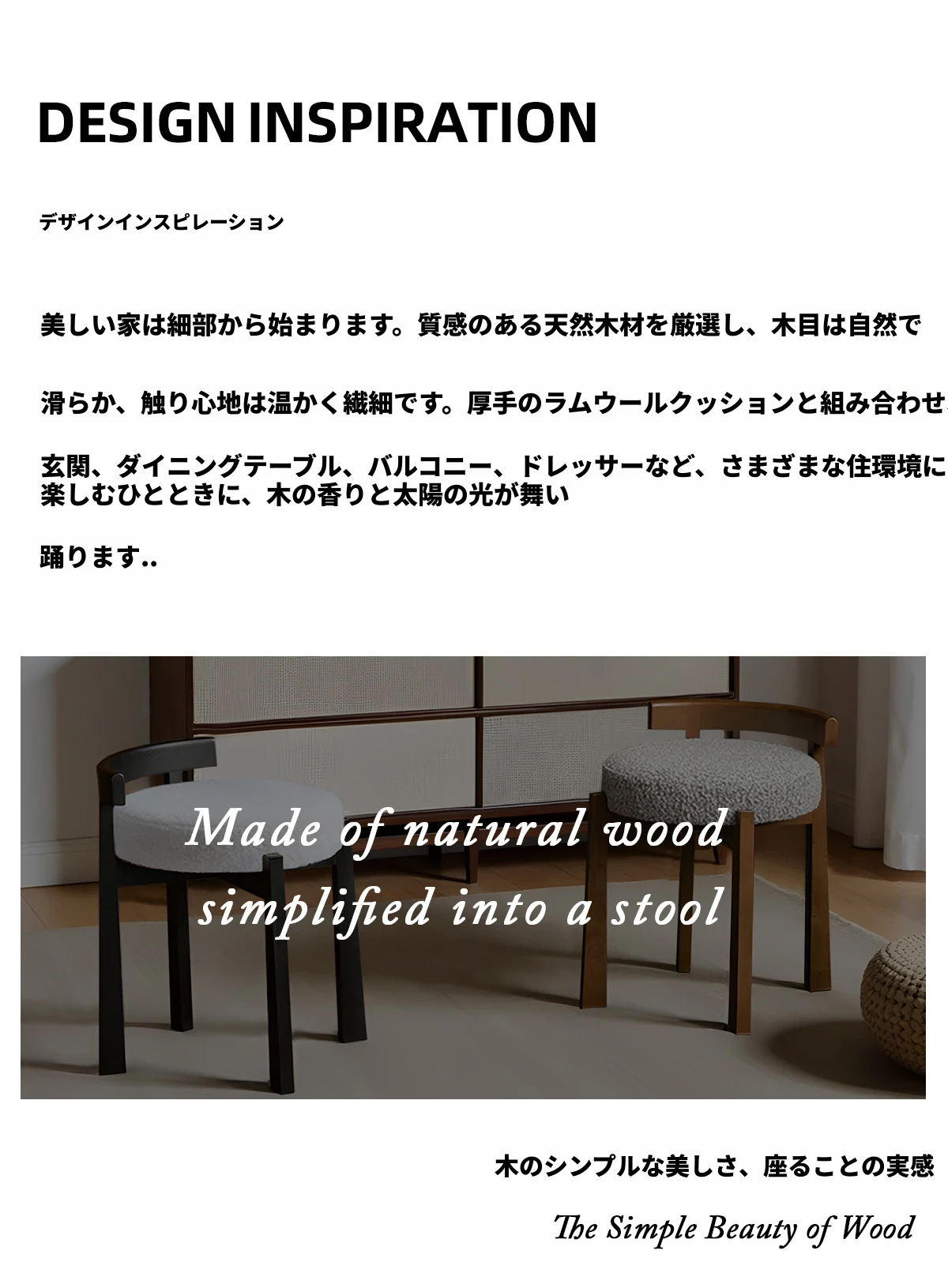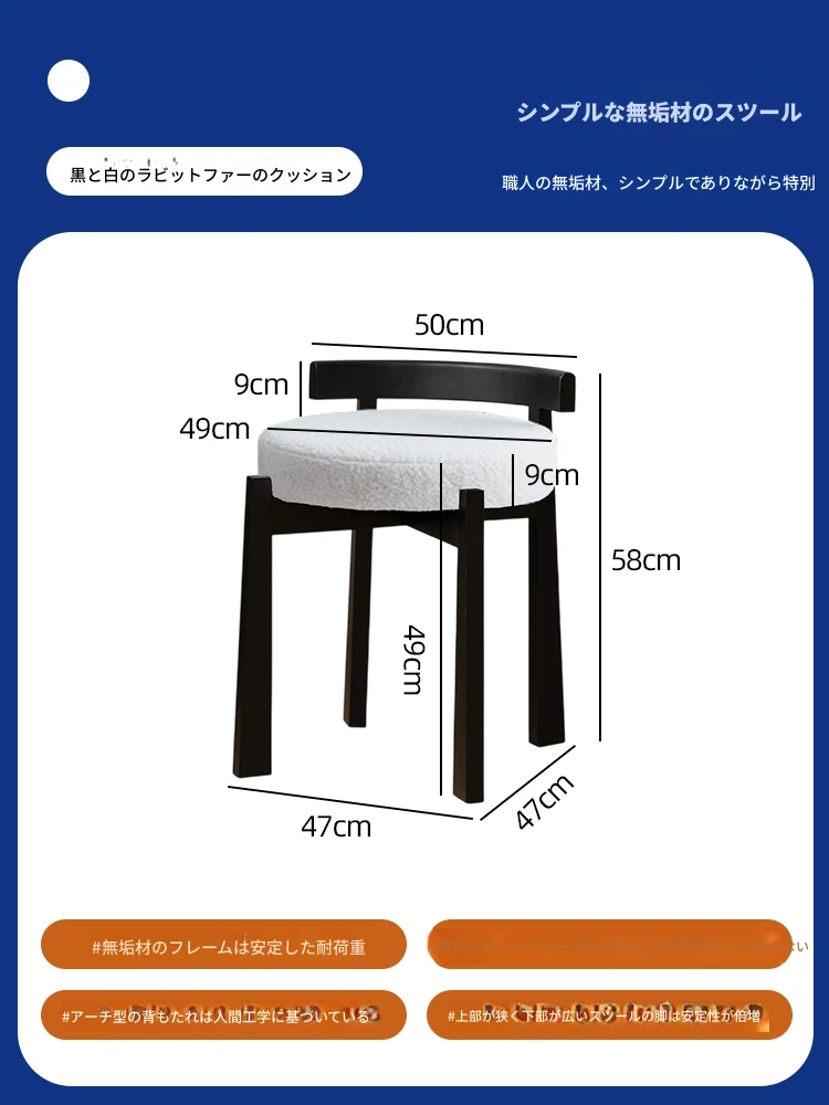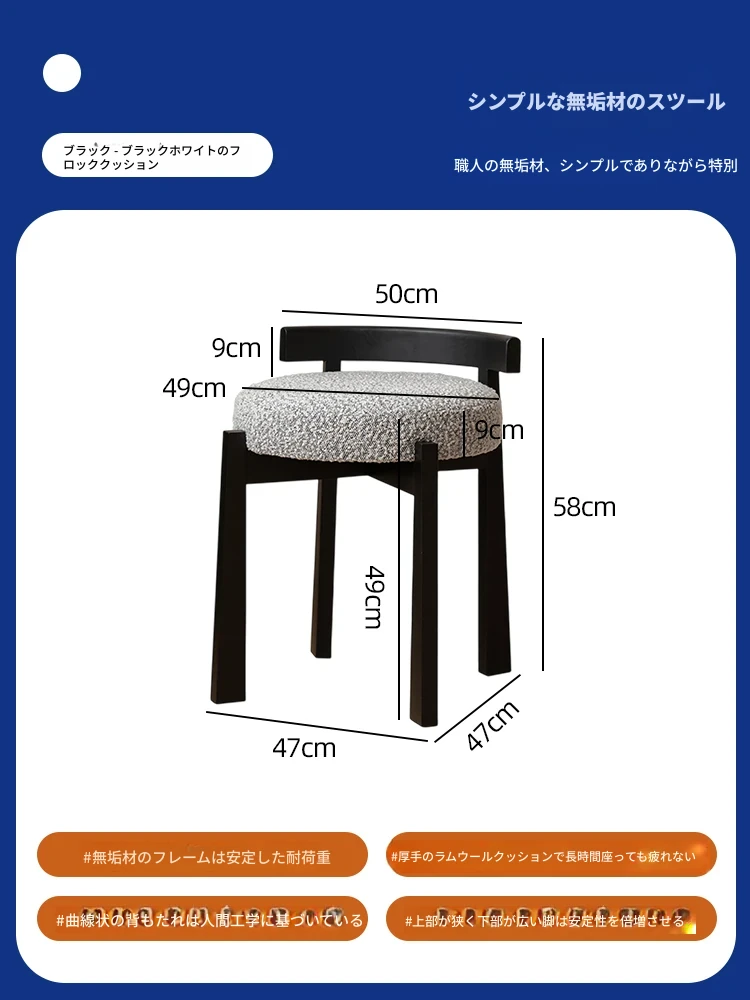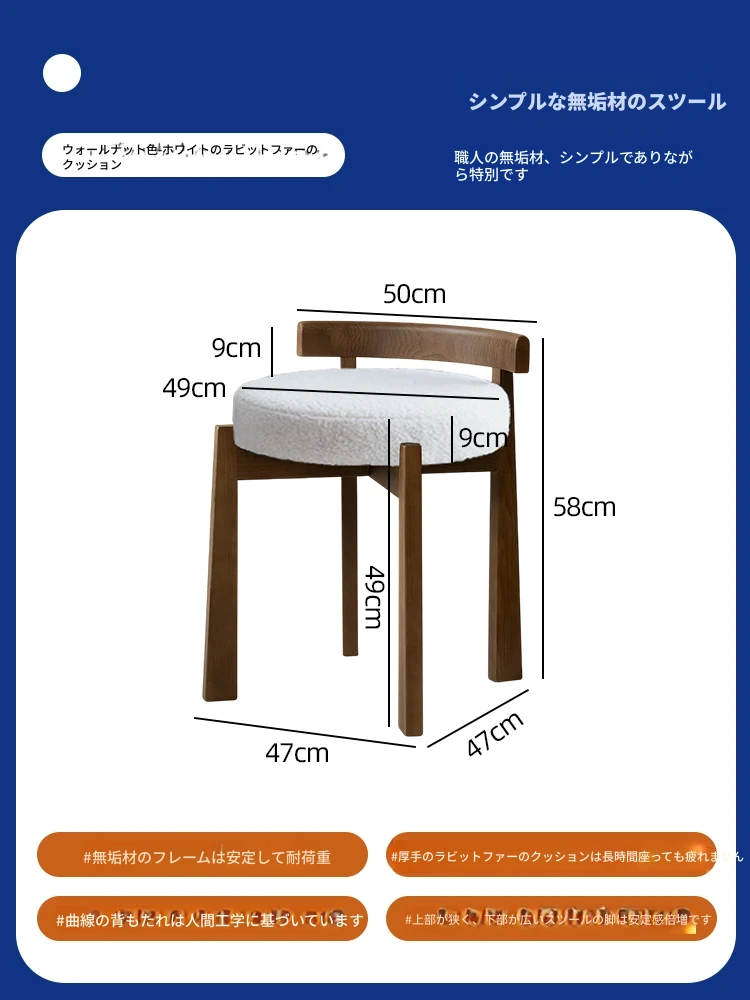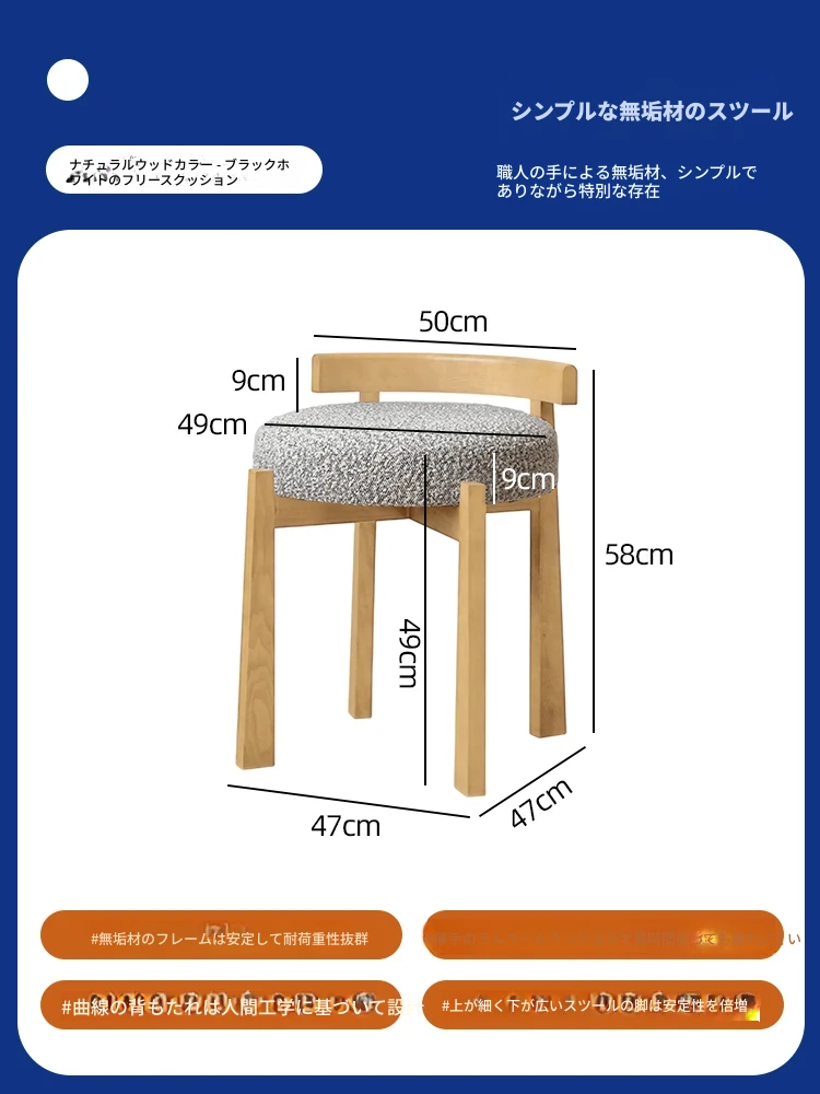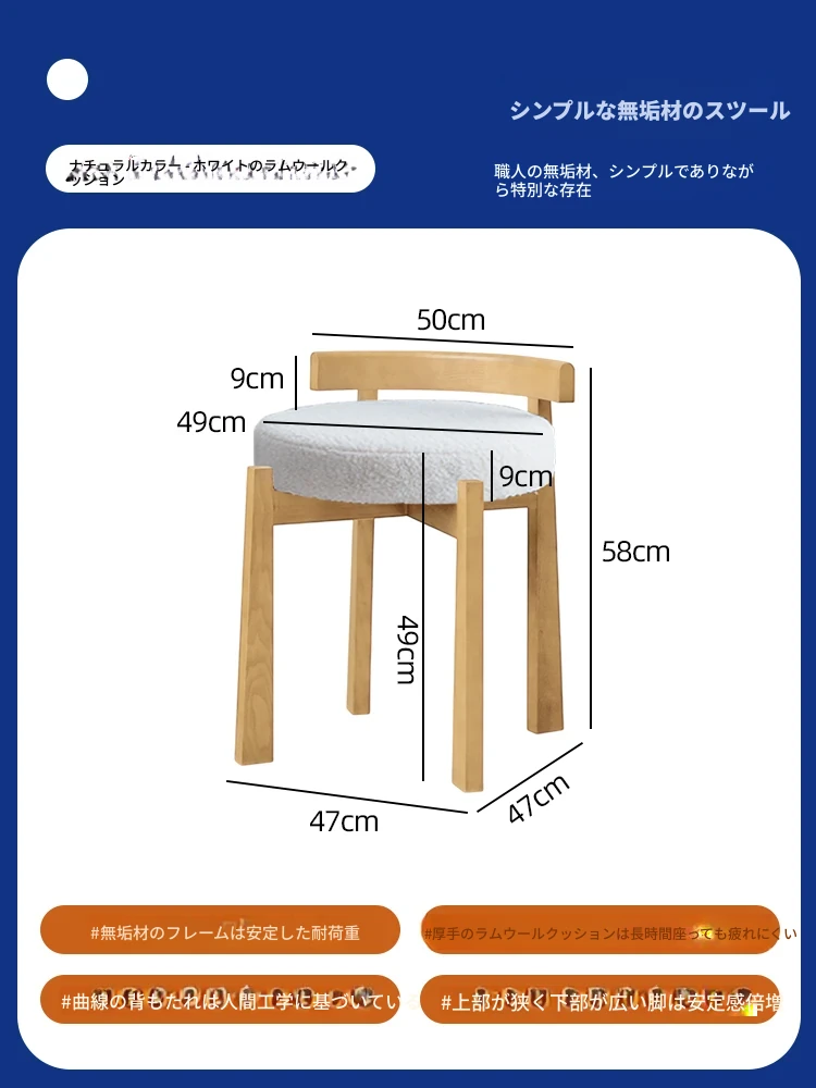 アイセンロントの無垢材を使用したヴィンテージ風メイクアップスツール!省スペース設計で、女性の寝室にぴったり。柔らかなクッション付きで、美容やネイルにも最適なラウンドドレッシングチェア!