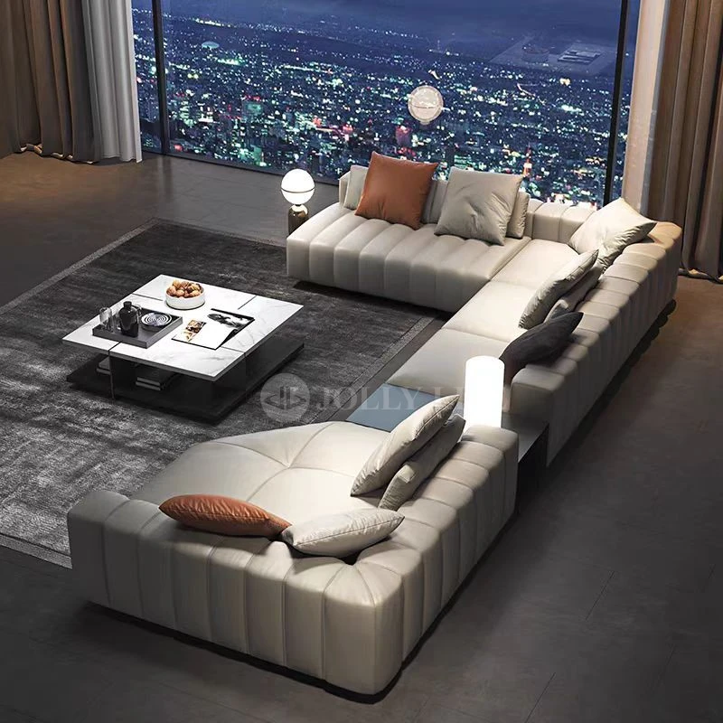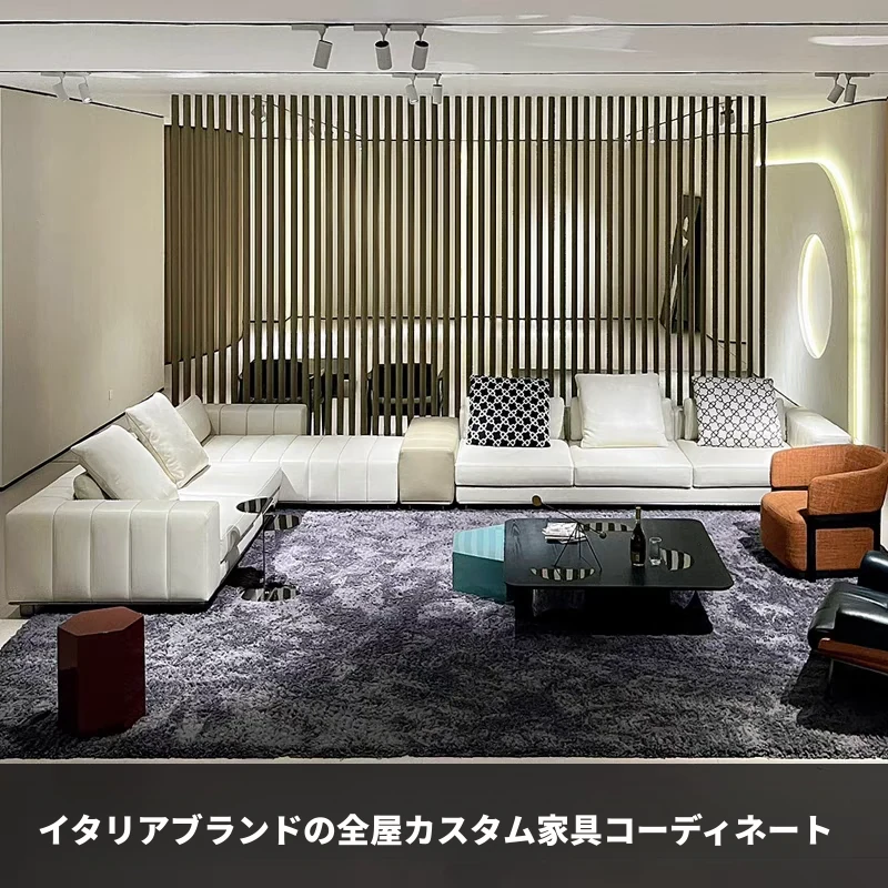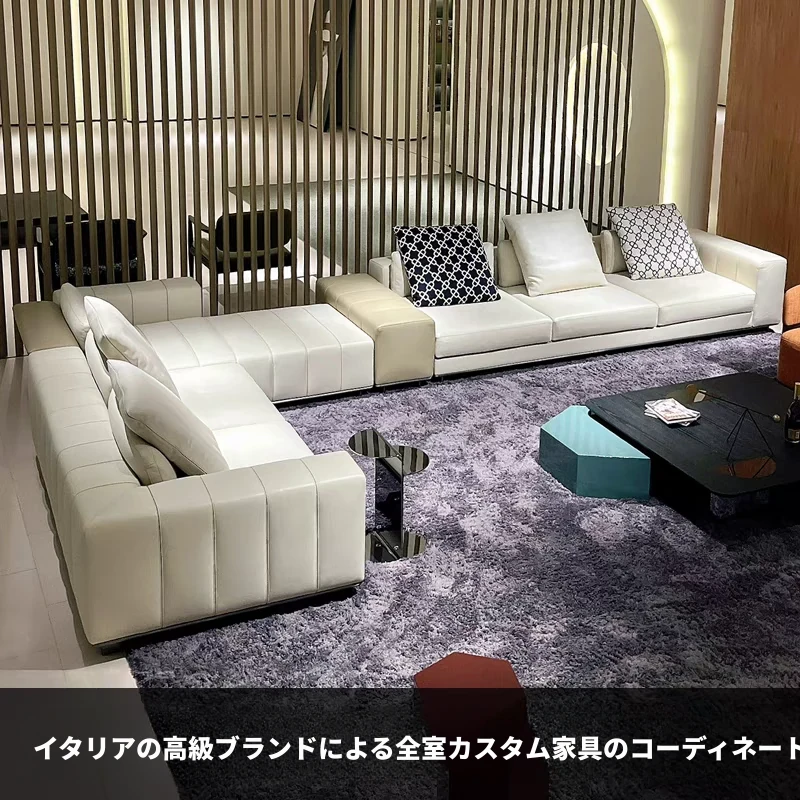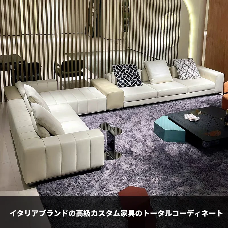 イタリアンラグジュアリー仕様のリビングルーム用コーナーソファ - 上質なトップグレインレザー使用、デザイナーによる洗練されたインテリアサンプルルーム。スタイリッシュなピアノキー柄で、サイズも多様に対応!