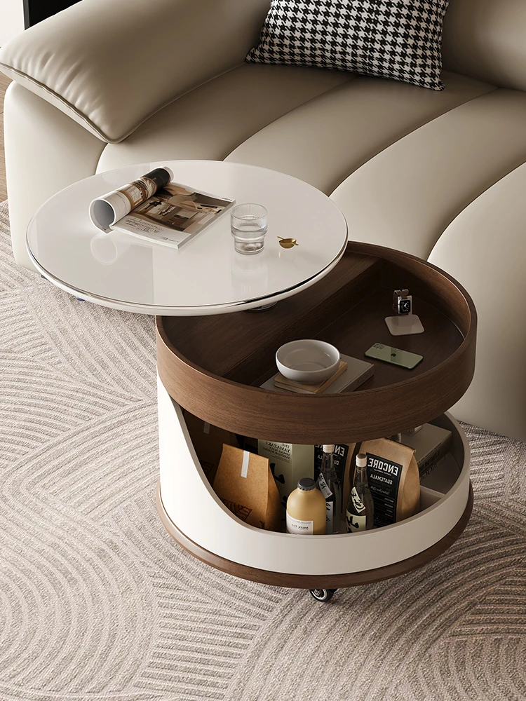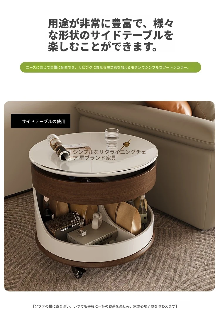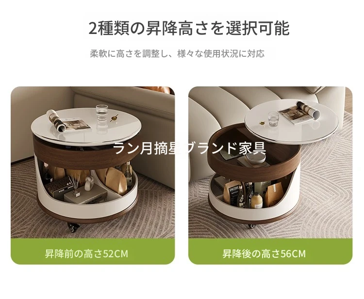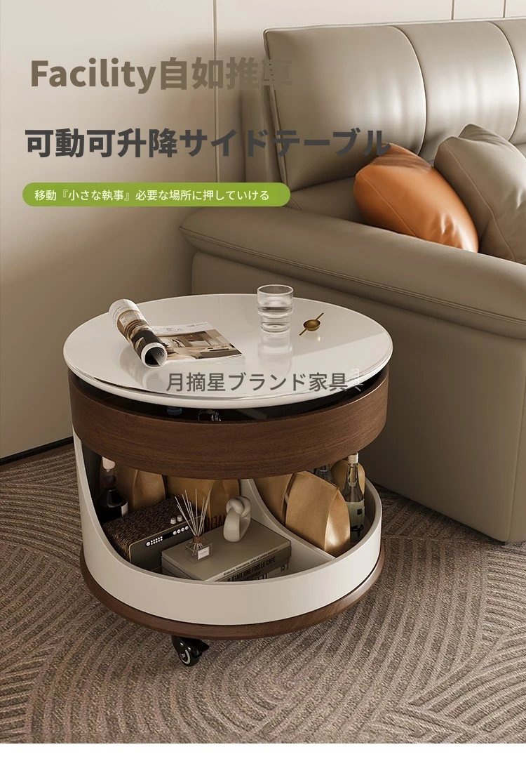イタリアンミニマリストデザインの円形モバイルコーヒーテーブル - リビングにぴったりの多機能サイドテーブル、昇降可能な収納付きキャリーカート!小スペースにも最適!
