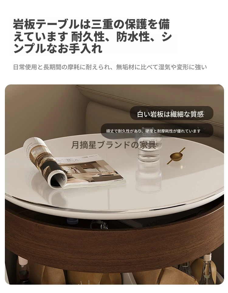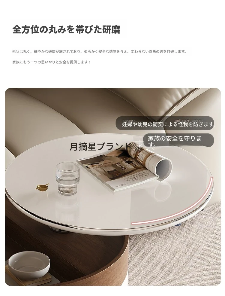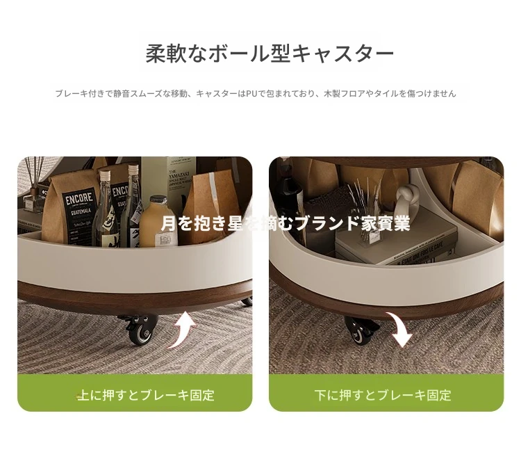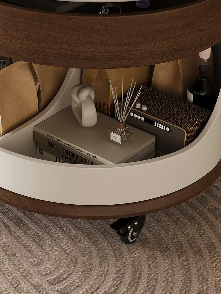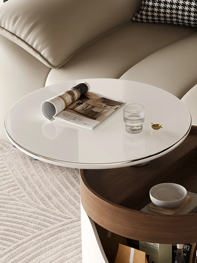 イタリアンミニマリストデザインの円形モバイルコーヒーテーブル - リビングにぴったりの多機能サイドテーブル、昇降可能な収納付きキャリーカート!小スペースにも最適!