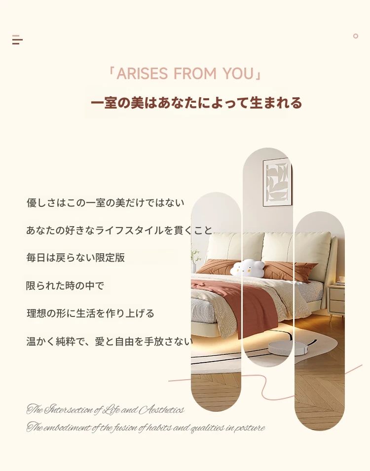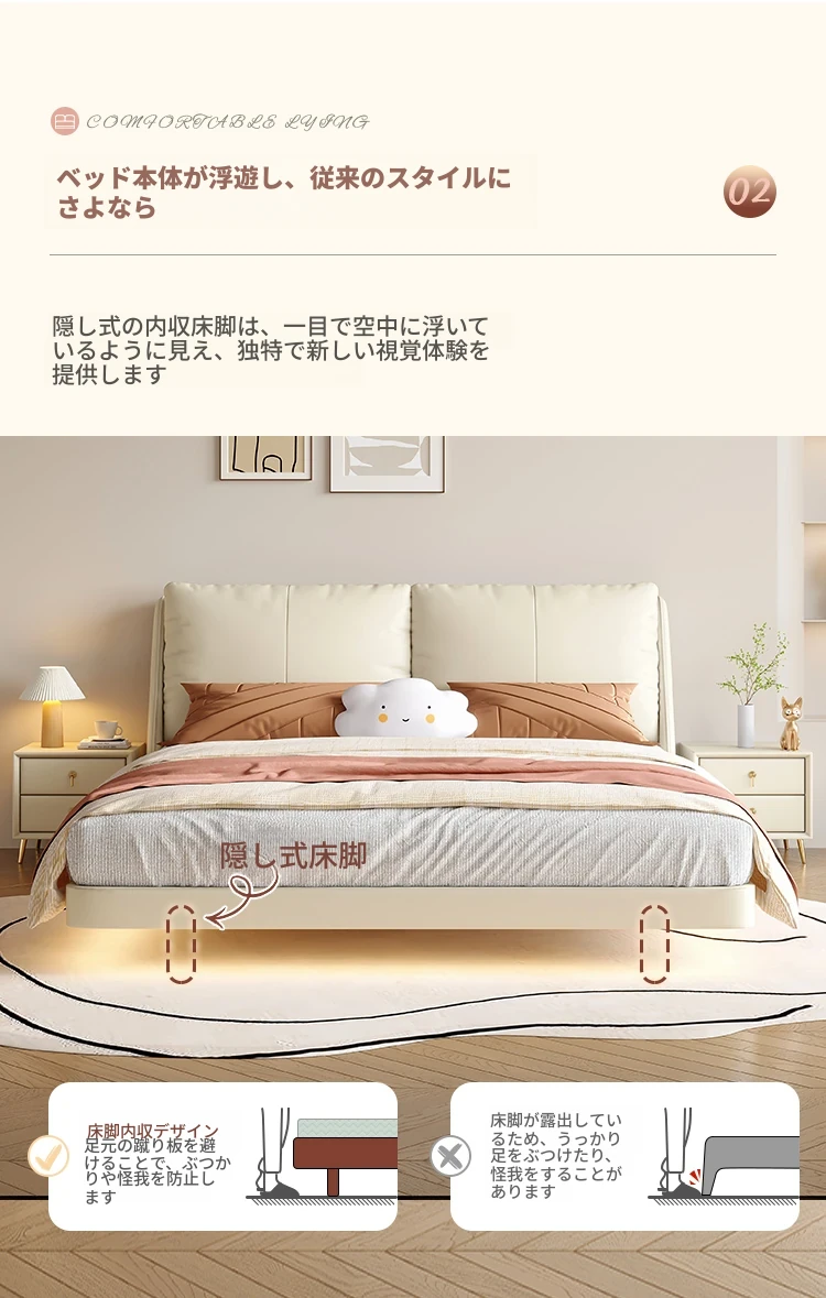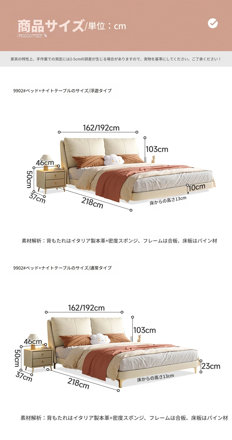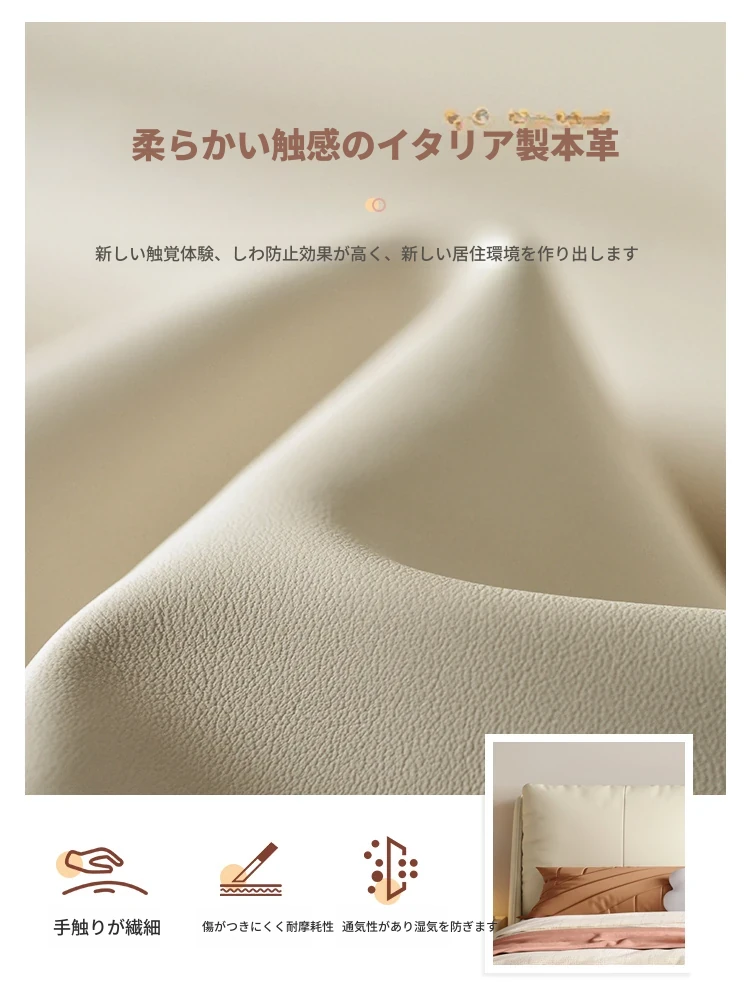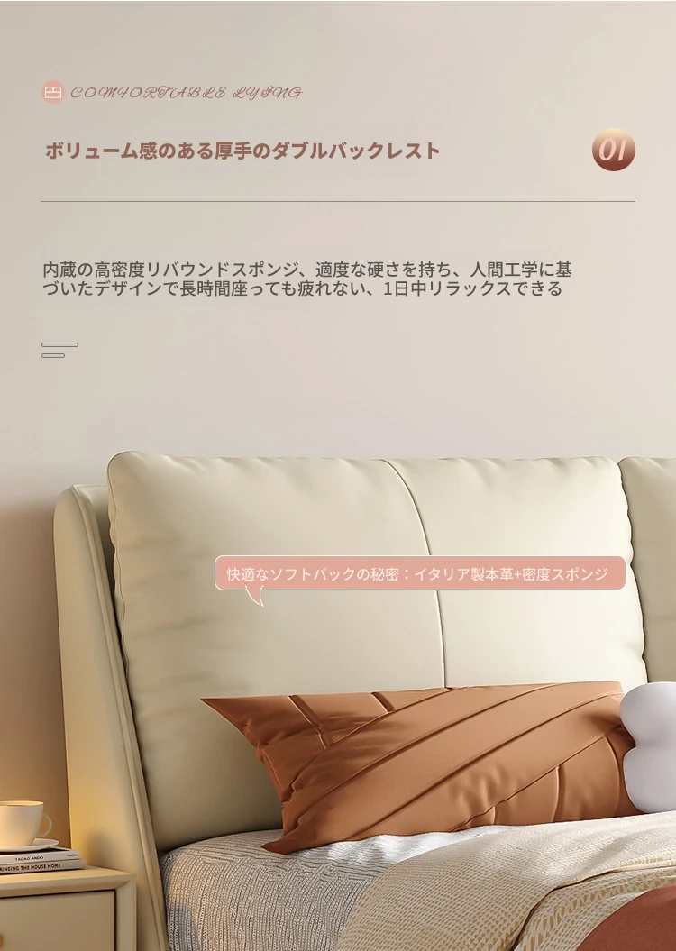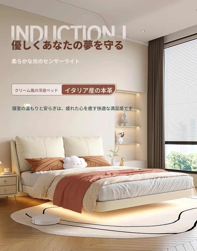 現代的ミニマリストスタイル イタリア製本革ベッド ソフトバックレスト付き 主寝室・客寝室用 ハイフローティングベッド 高脚デザイン 極上のシンプルさと高級感を兼ね備えた一品