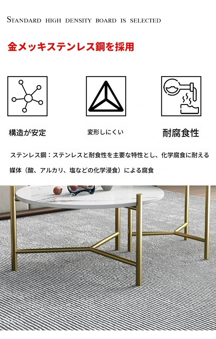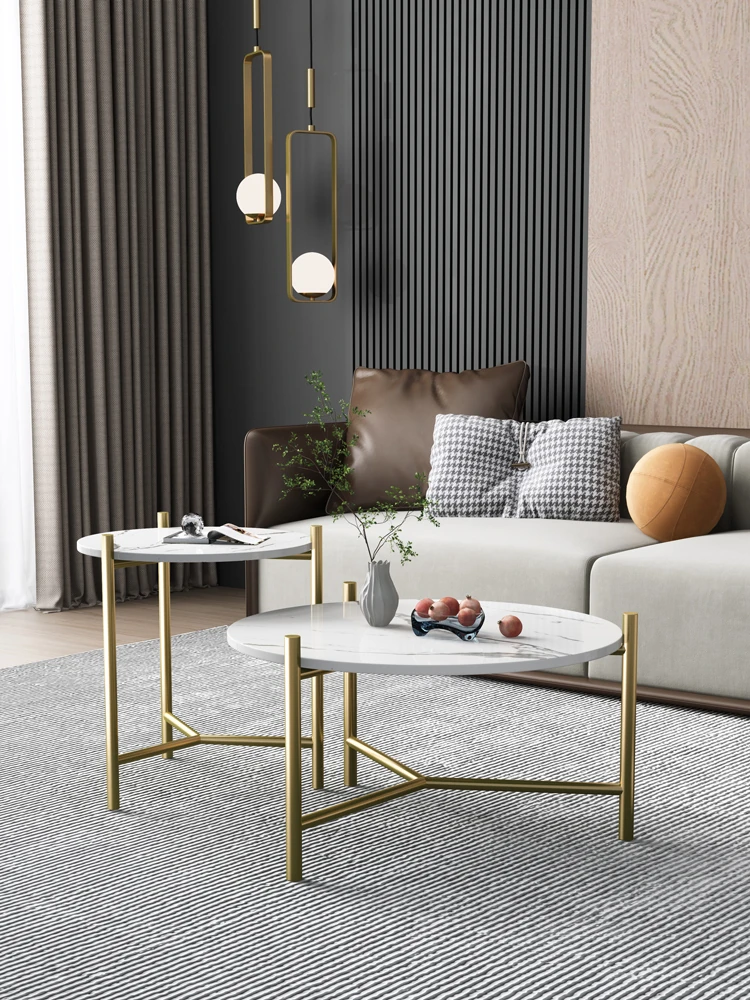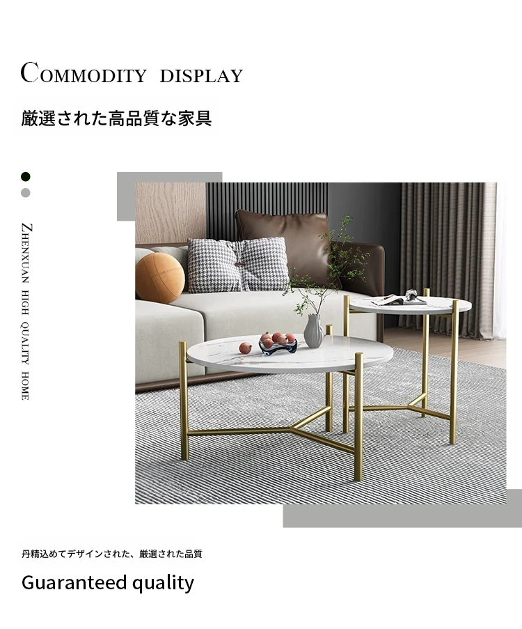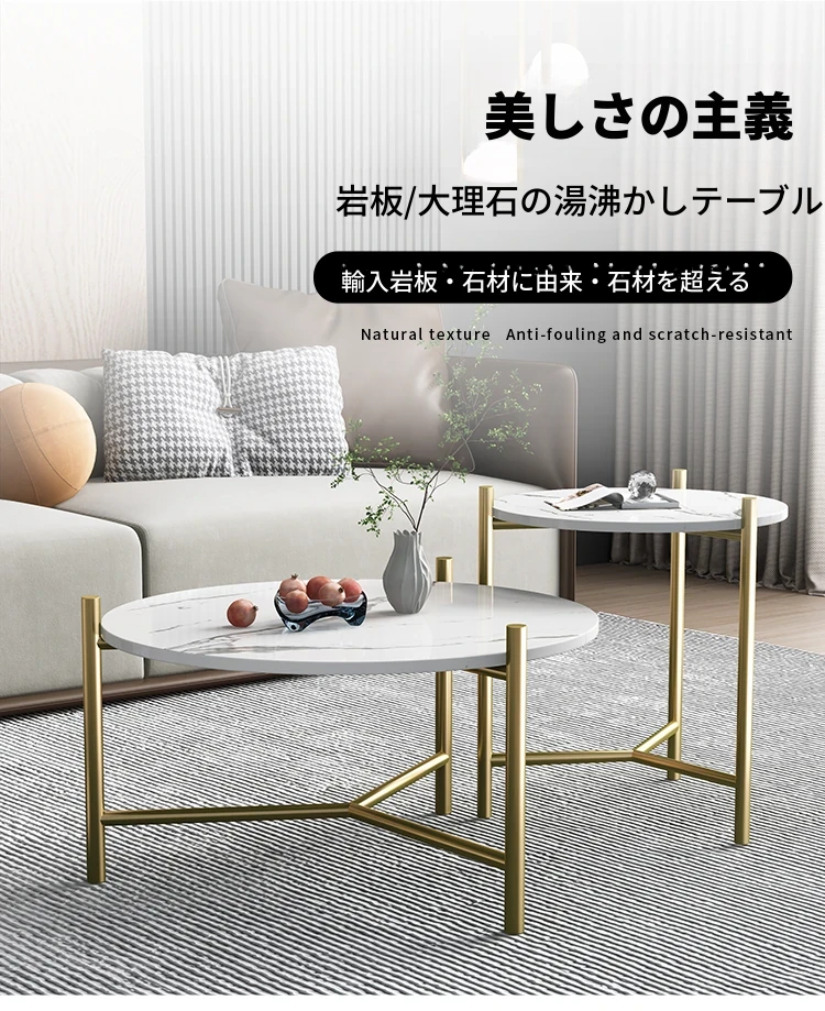 現代的シンプルなデザイン、注目の新作!岩板素材使用のスタイリッシュなステンレス製ラウンドコーヒーテーブル。小さなリビングにぴったりの極簡ミニマリストスタイル。ゴージャスなゴールドメッキ仕上げで、上質な空間を演出します!