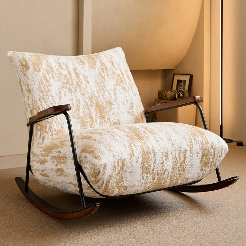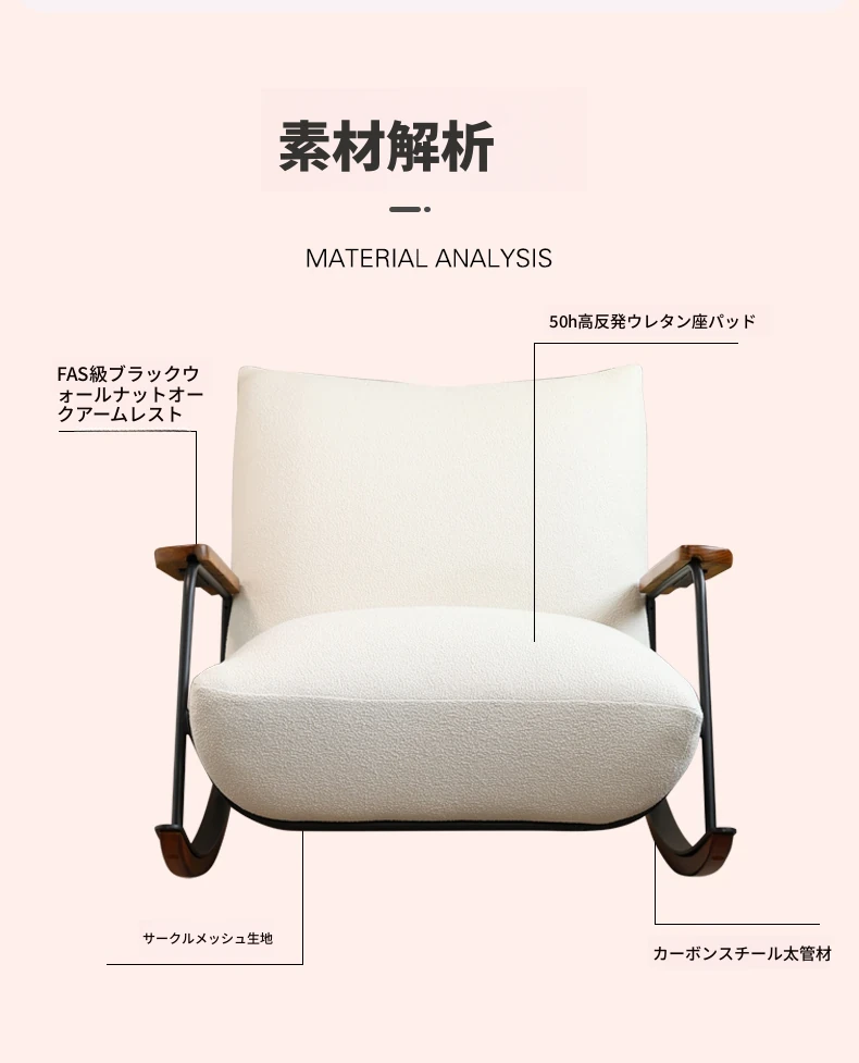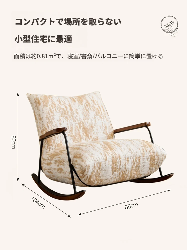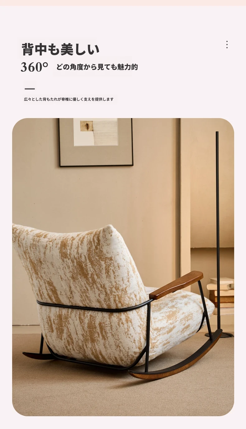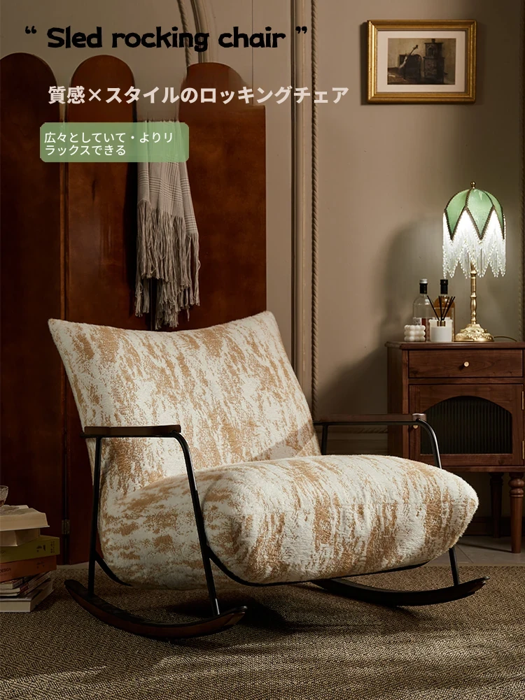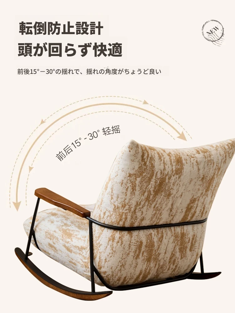 モダンなリラックスチェア!レトロなデザインの一人掛けソファは、あなたのリビングやアパートにぴったり。心地よい揺れで、くつろぎのひとときを提供します。おしゃれで快適な空間を演出する、軽やかなラグジュアリーを感じてみませんか?