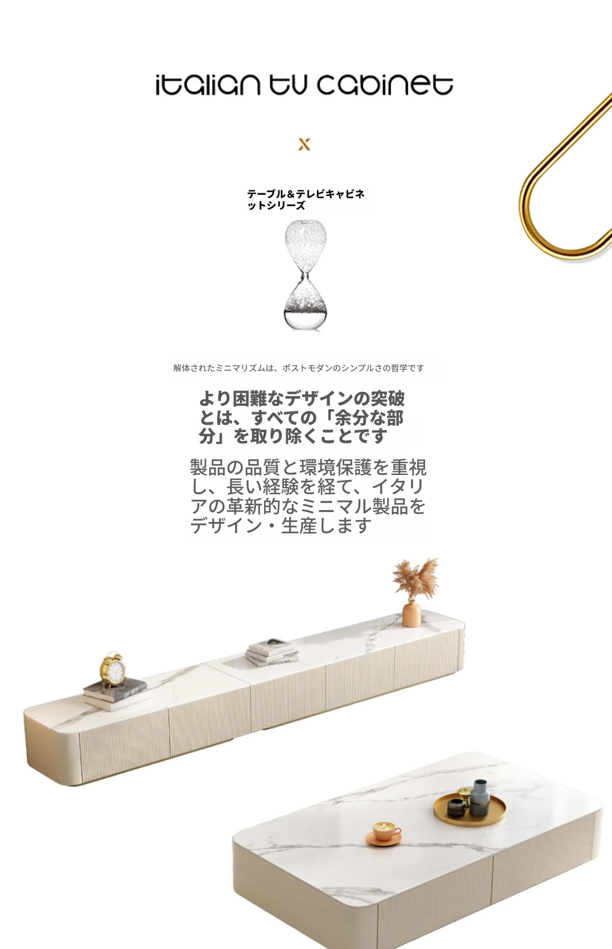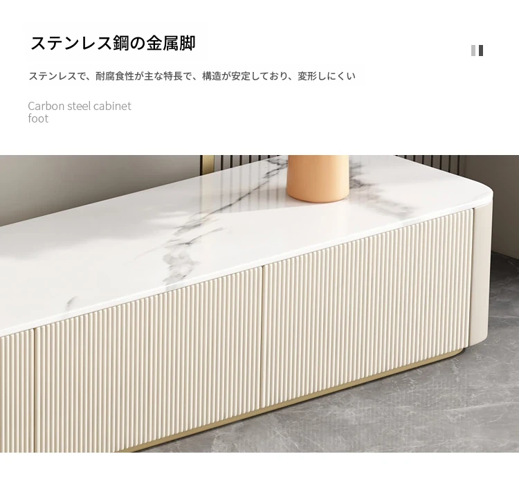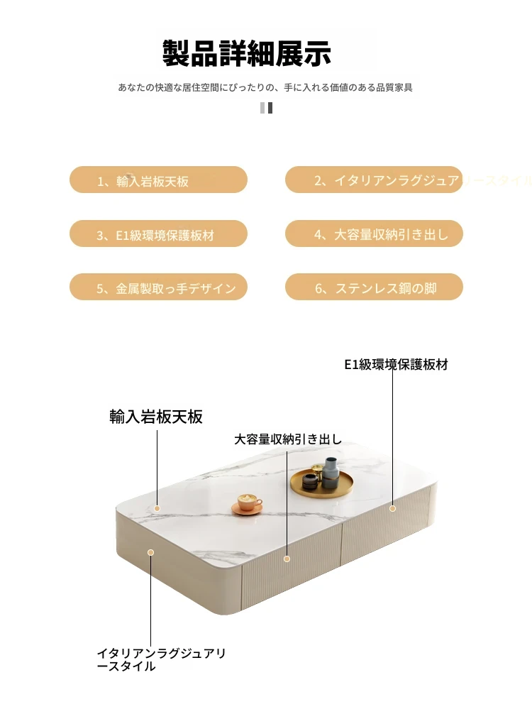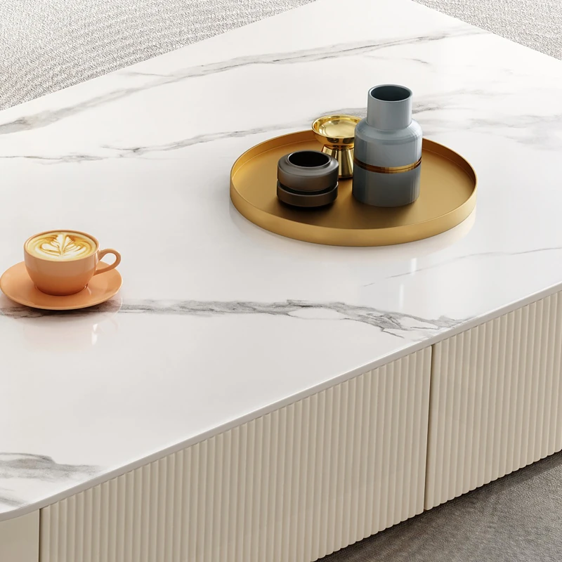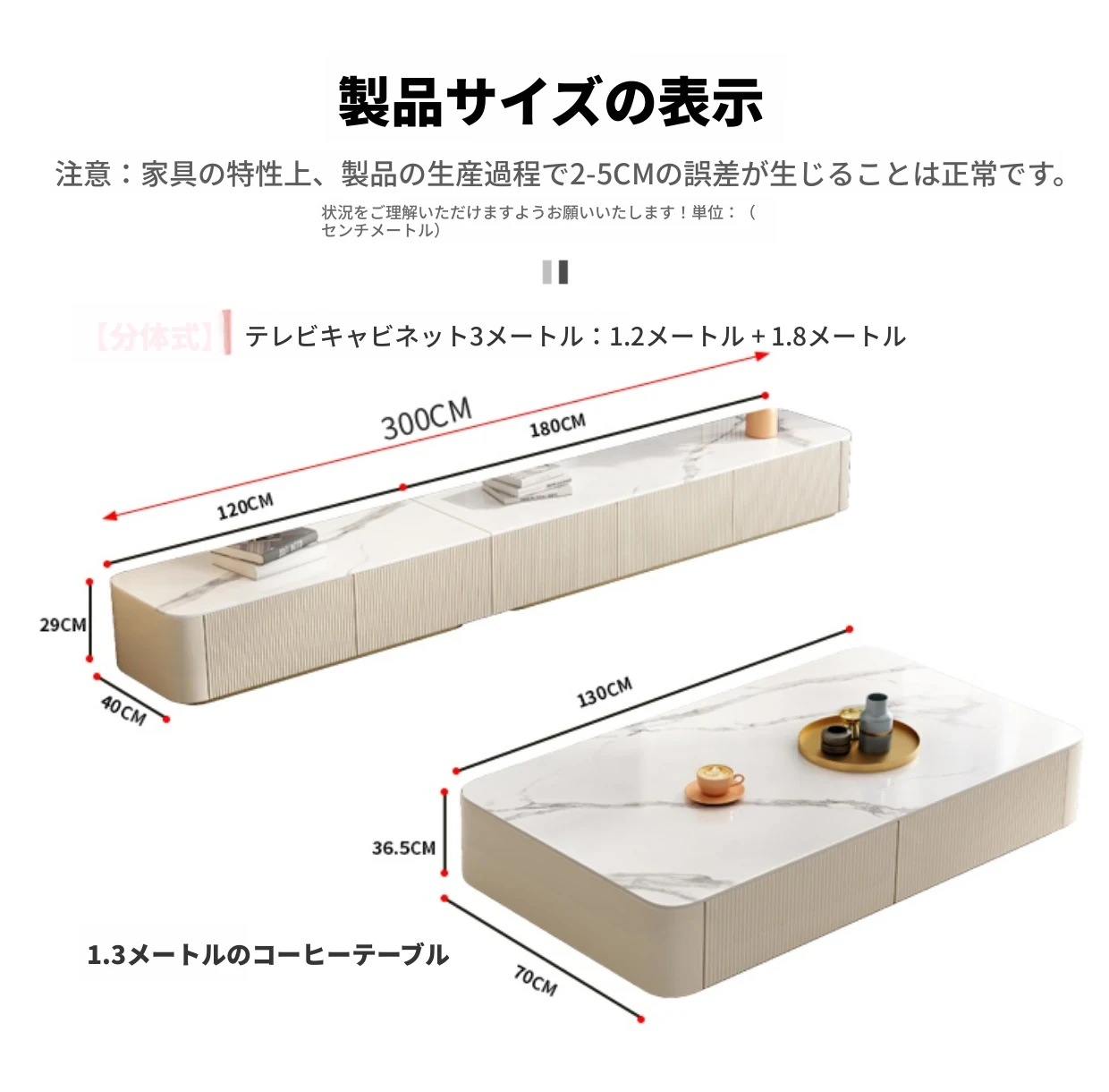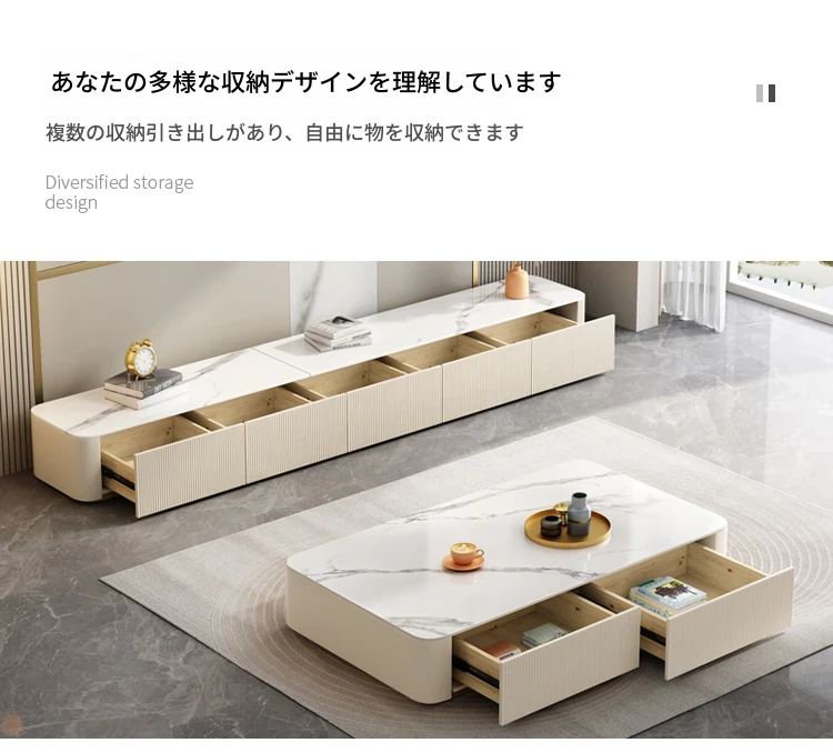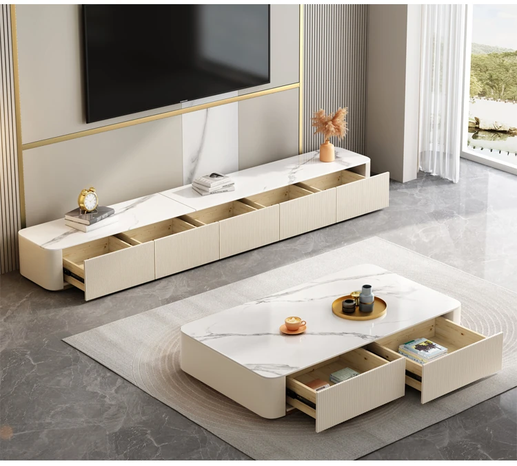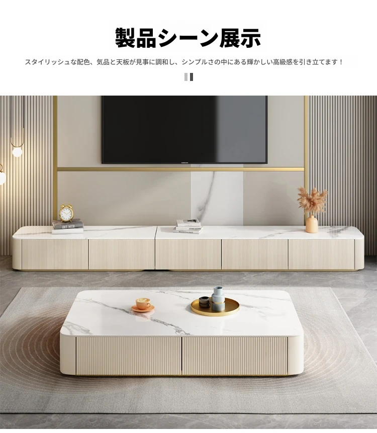 イタリアンミニマリズムのクリーム色光沢仕上げ、スタイリッシュな岩板製のコーヒーテーブル&テレビキャビネットセット。便利なフロア引き出し付き、注目の雪山石デザインでお部屋を華やかに演出!
