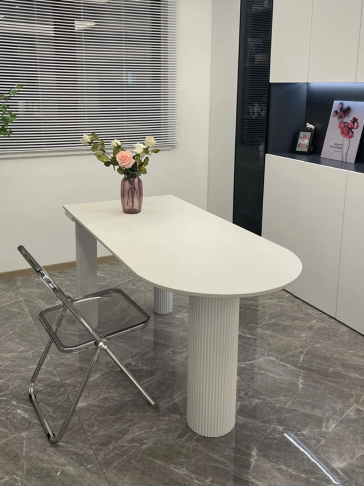 現代的ラグジュアリーな純白の石板ダイニングテーブル - デザイナーによるローマ柱スタイル、小型住宅にもぴったりなアイランドテーブル、アートのようなアウトドアダイニングテーブルです。あなたの空間に洗練された美しさをプラス!
