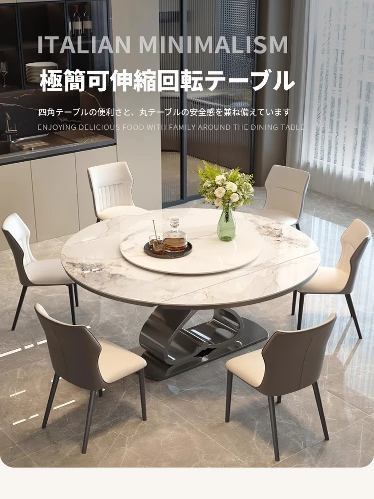 折りたたみ式の円形ダイニングテーブル|現代的でシンプルなデザイン|小さなスペースにも最適|高級感あふれる岩板素材|丸型・四角型の2Way仕様で使い方自由自在!新しいライフスタイルを楽しもう!