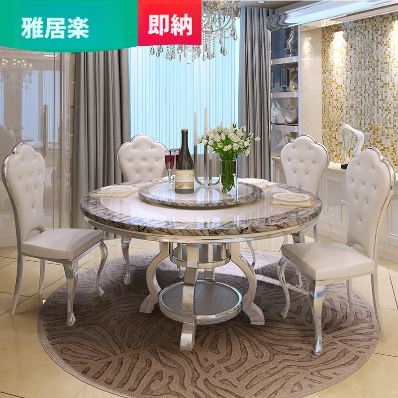 モダンな欧風大理石ダイニングテーブルセット - 回転盤付き、ステンレス製の円形テーブルと椅子のコンビネーションで、シンプルかつエレガントなお食事空間を演出します。
