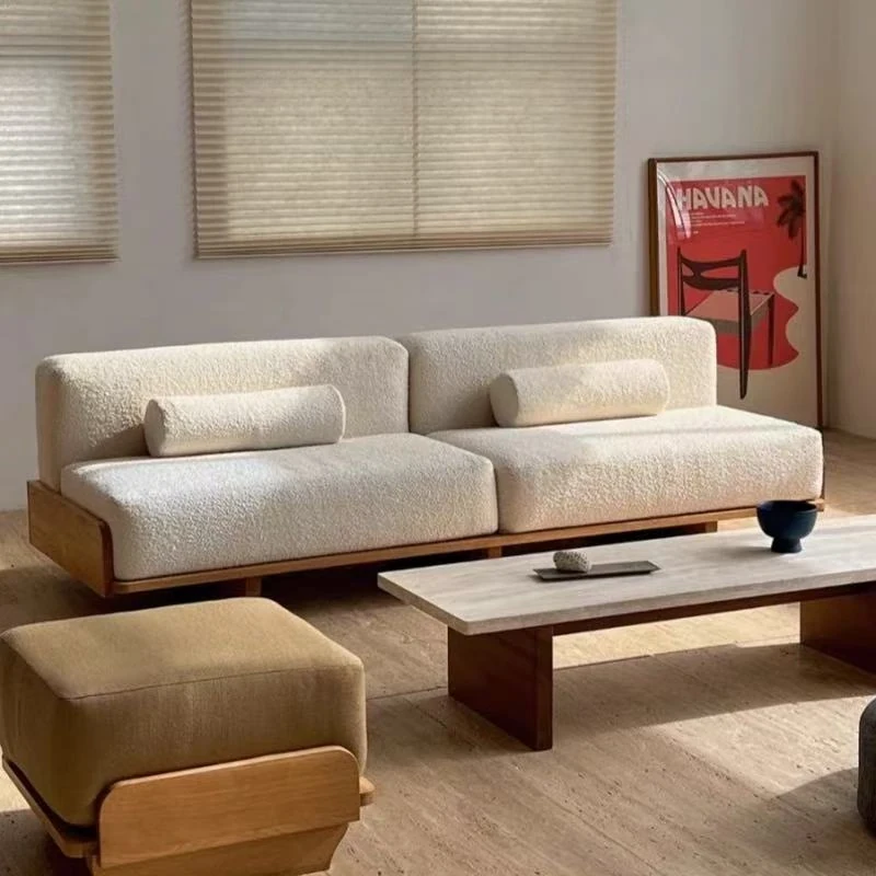 北欧スタイルの無垢材ダブル&トリプルソファセット - ヴィラやホテル、民宿にぴったりなレトロなアンティーク風デザイン!フットスツール付きで、快適なひとときを提供します。