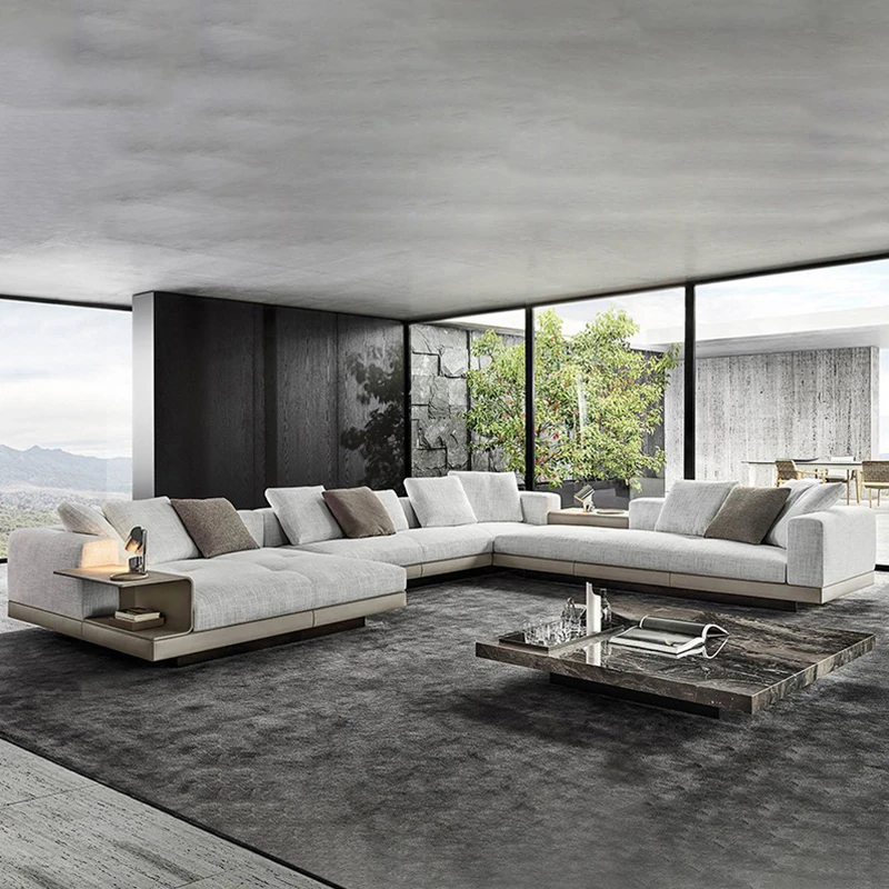 イタリアンミニマルスタイルの広々リビング向けダウンソファ。高級感あふれるコットンリネンと本革コンビの洗練されたデザインで、心地よいひと時を演出します。