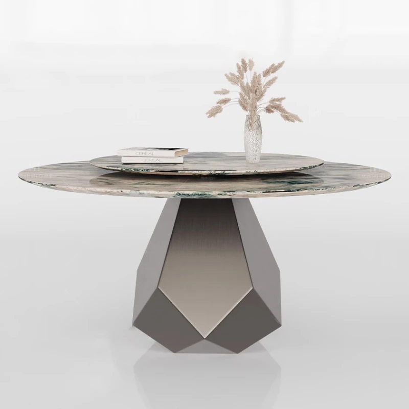 ラグジュアリーな大理石円形ダイニングテーブル - 回転プレート付き、イタリアンスタイルの軽やかな高級デザイン。別荘や家庭に最適な高品質の天然大理石製。おしゃれで洗練された食卓を演出します!