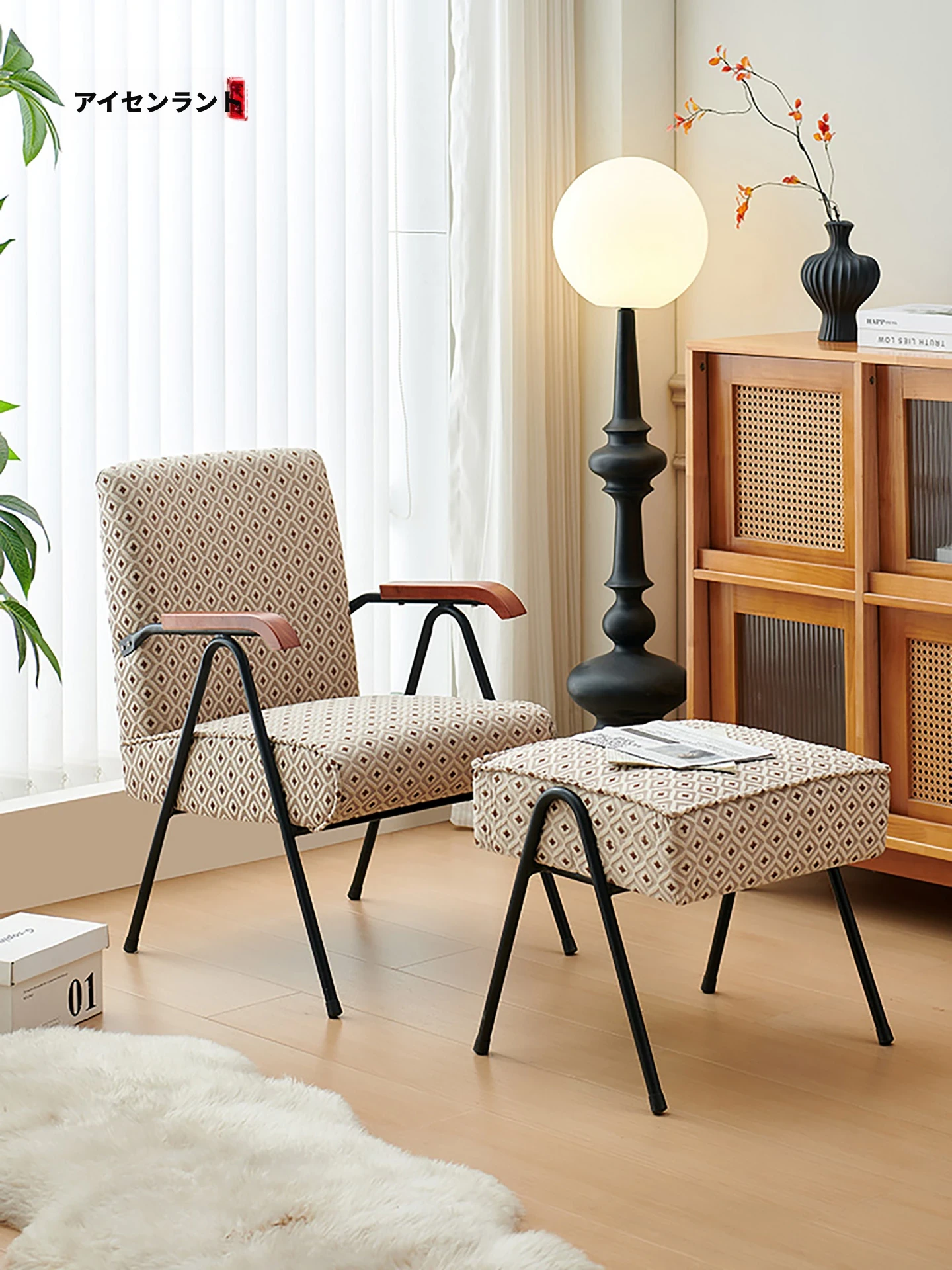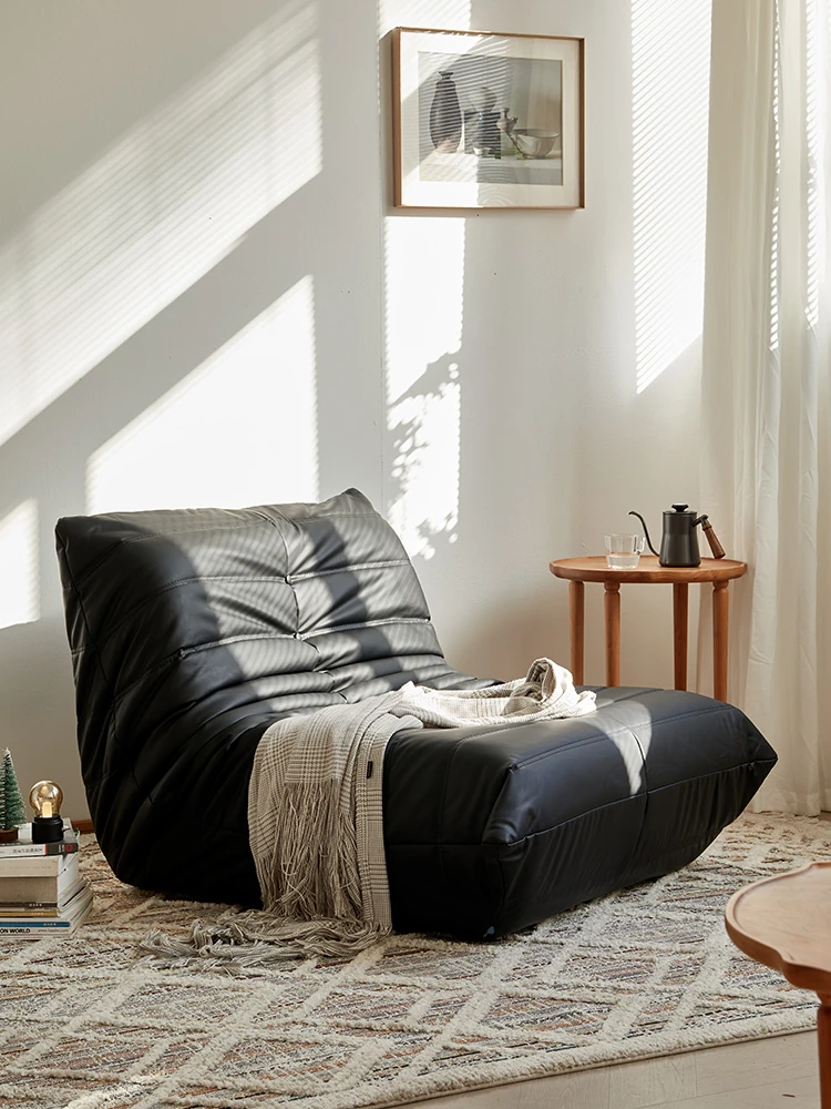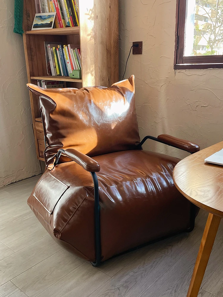 北欧スタイルのリラックスソファチェア|一人用・高品質レザー製・タタミスタイルの小型リクライニングチェア|カフェやレストランに最適なインダストリアル風ソファ!快適さとおしゃれを兼ね備えた一品です。