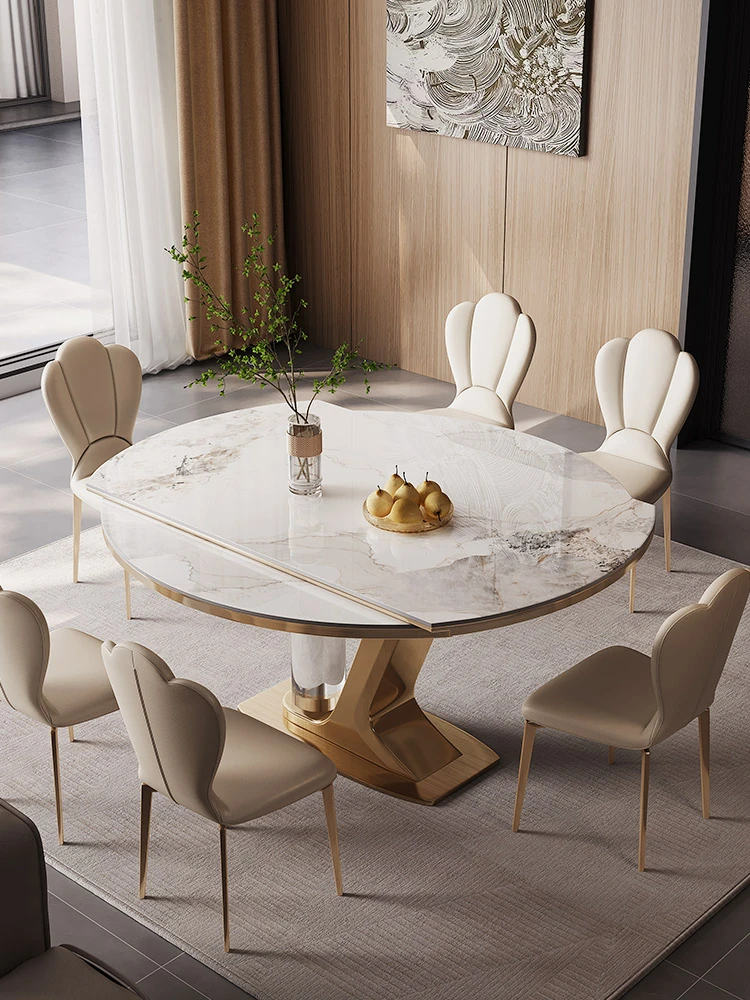 イタリアンスタイルの軽奢感!四角形と丸形の二通りに変形可能な高級感あふれる岩板ダイニングテーブル。現代的なシンプルデザインで小さなスペースにもぴったり、伸縮機能付きで便利!