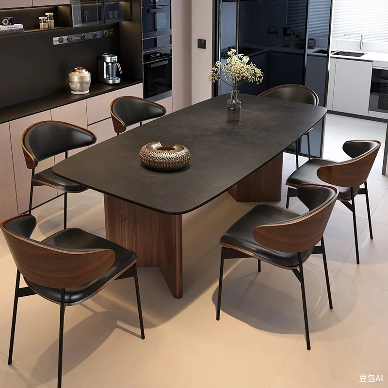 2024年新作!高級感溢れる無垢材ロックボードダイニングテーブル - ウォルナット色のレトロデザイン、小スペースに最適な長方形テーブル&チェアセット。家族団らんやおしゃれな食事シーンを演出!